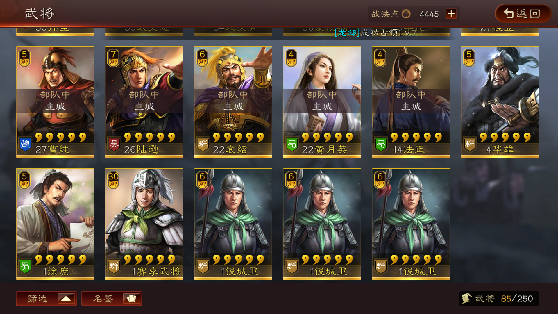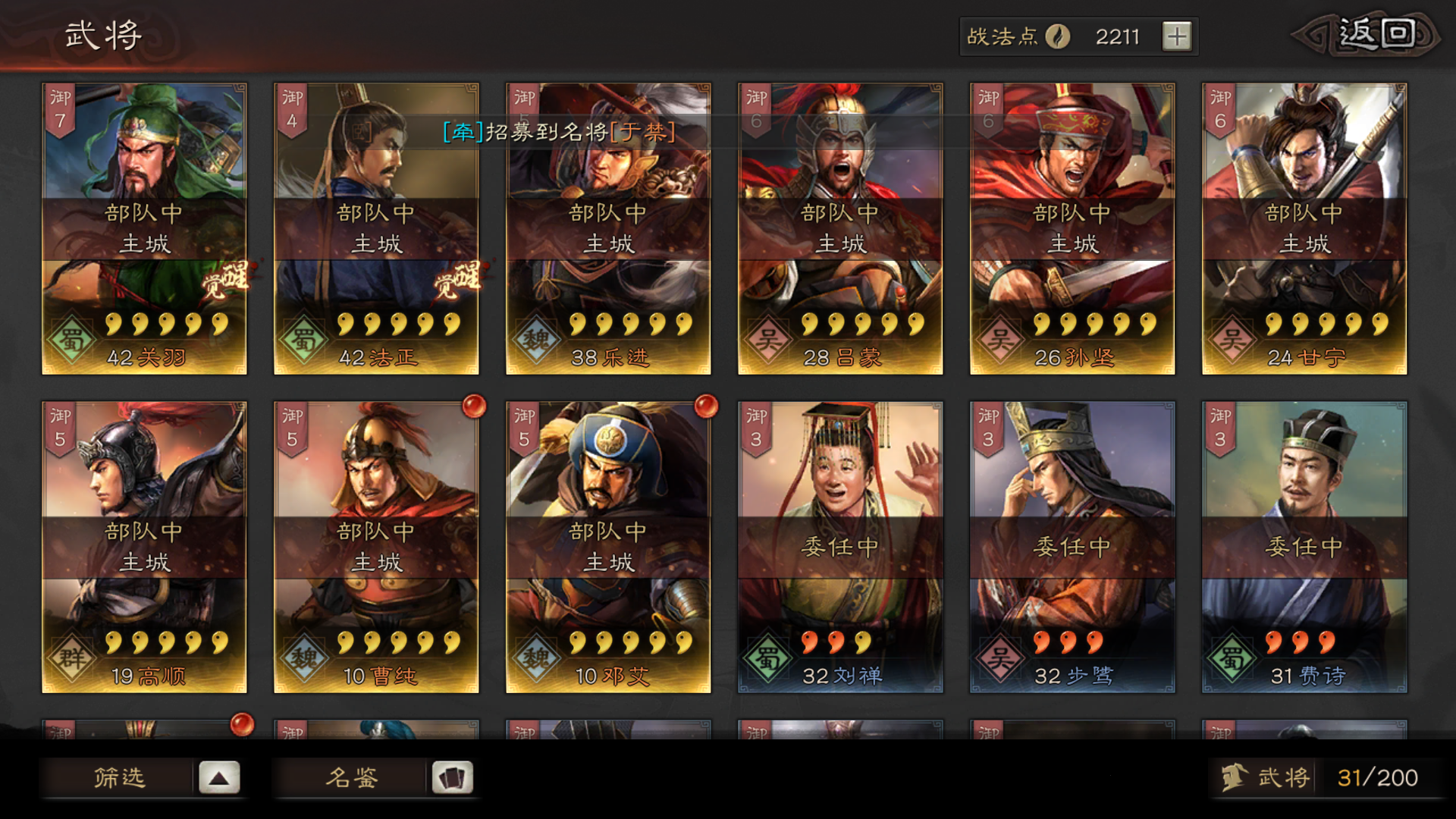 魏:夏侯渊,夏侯惇,许猪,典韦,乐进,郭嘉,庞德蜀:赵云,张飞,徐庶,张姬吴:甘宁,程晋,黄盖群:吕布,陈宫,袁绍,田丰,左慈,李儒s战法:所向披靡,盛气凌敌,破阵摧坚,杯蛇鬼车,八门金锁正,百骑劫营,折冲御妹,战必先风,白马义从,万箭齐发a战法:基本都有