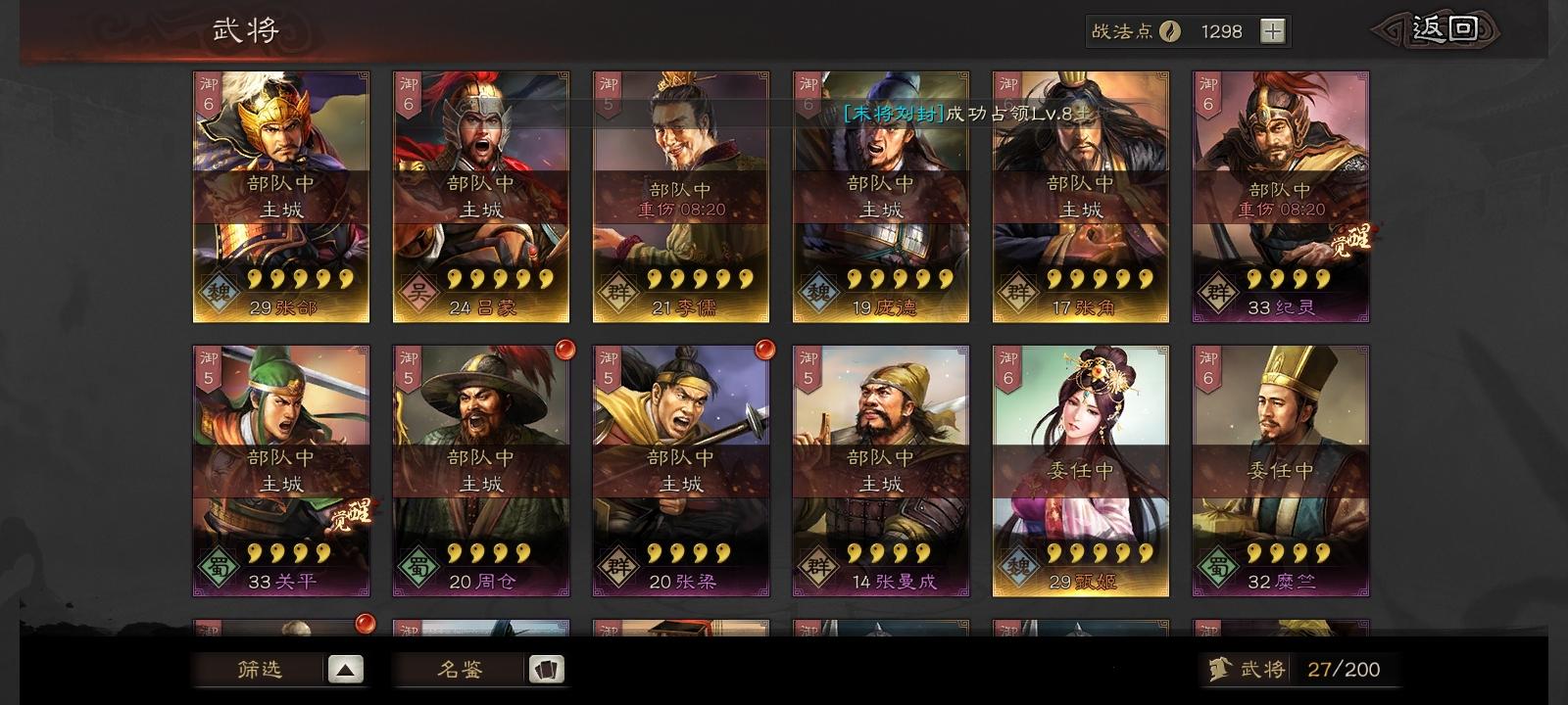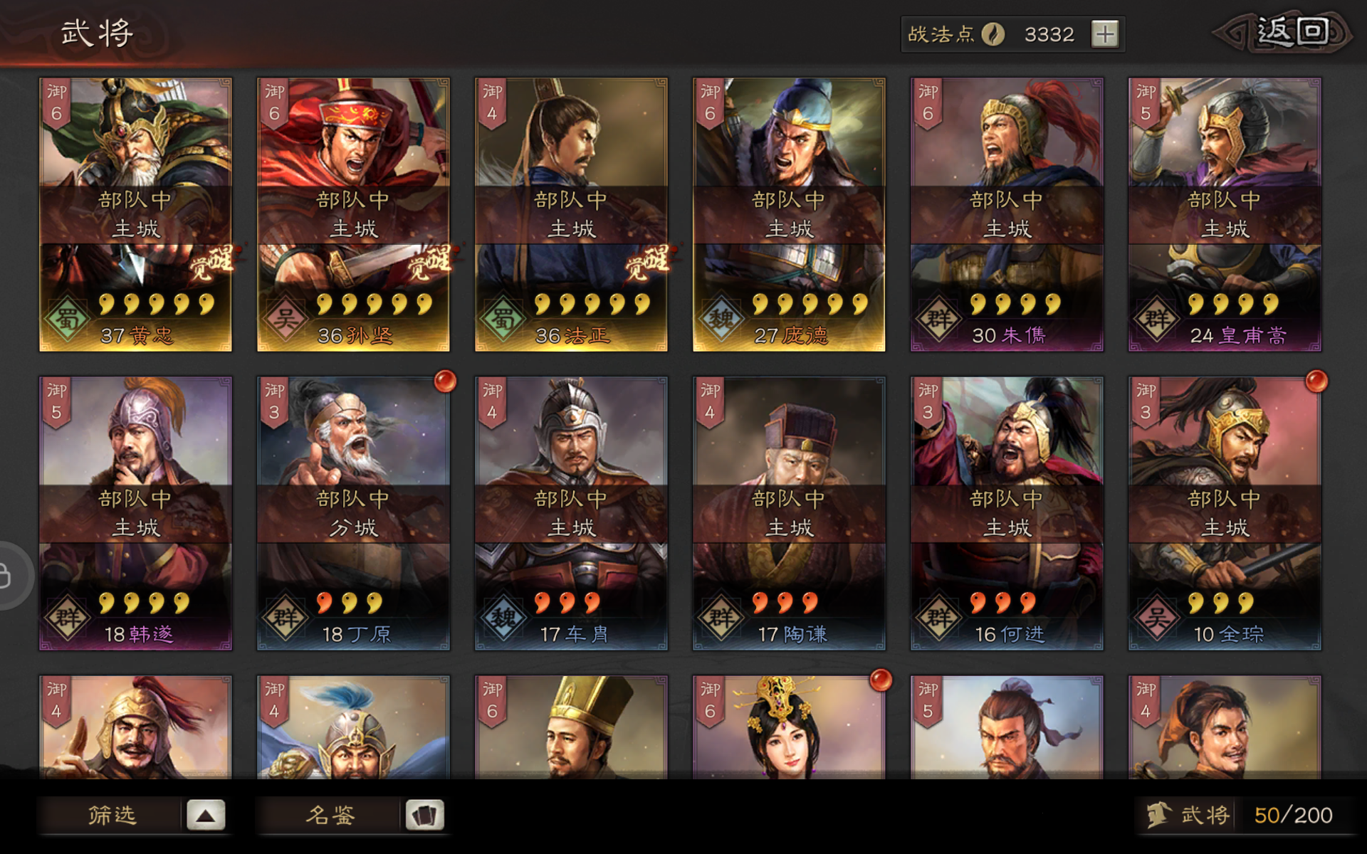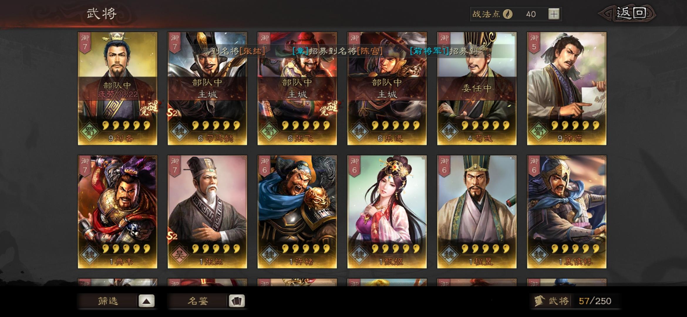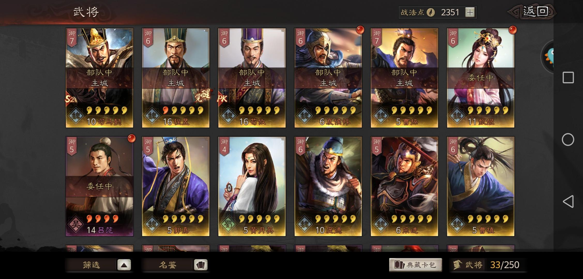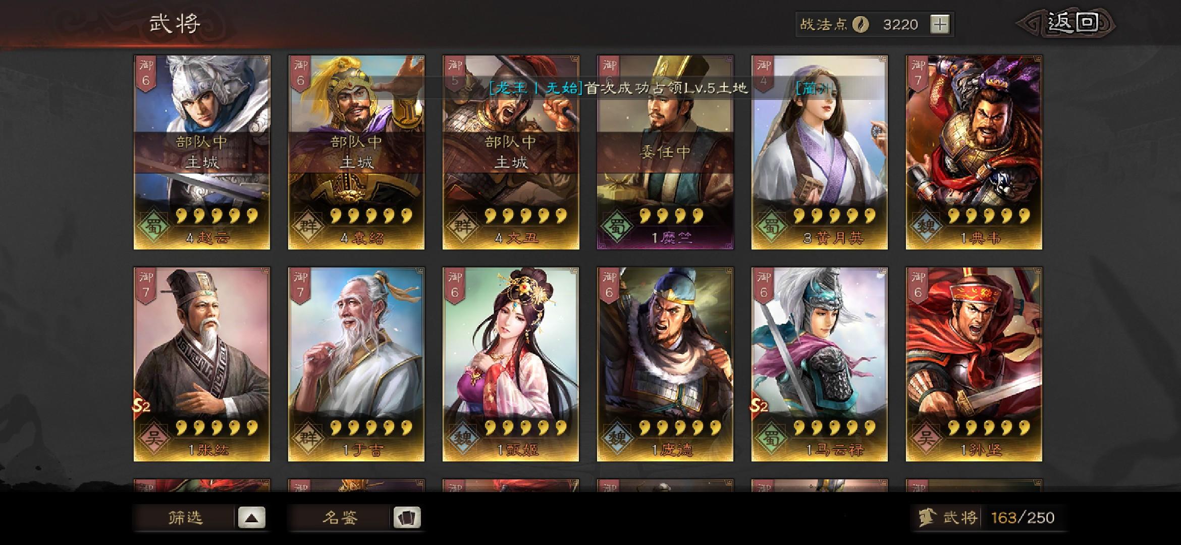 s2开荒求配将!s1主玩的魏盾(徐晃 曹仁 郭淮),吴弓(陆逊 甘宁 吕蒙),新抽了一个香香不知道能不能用上