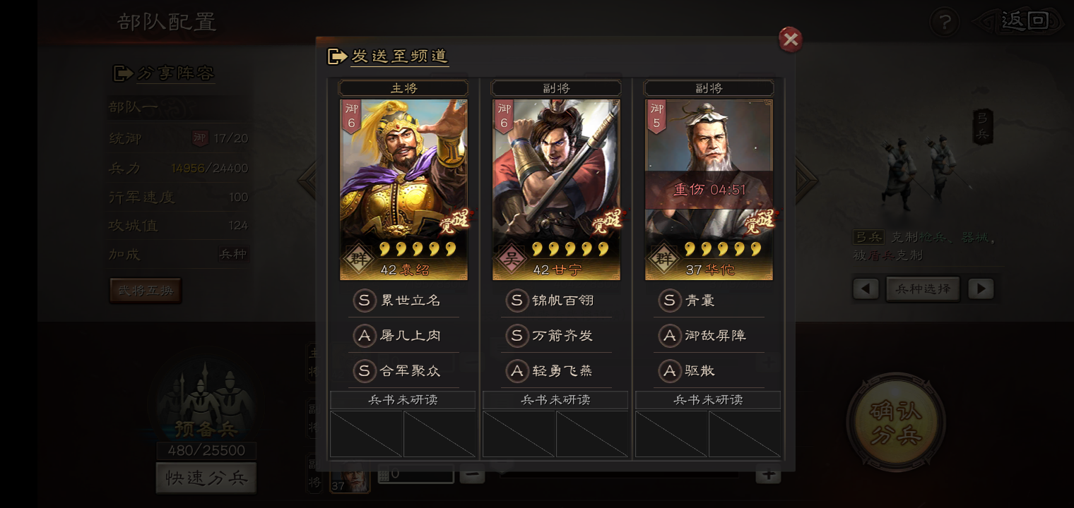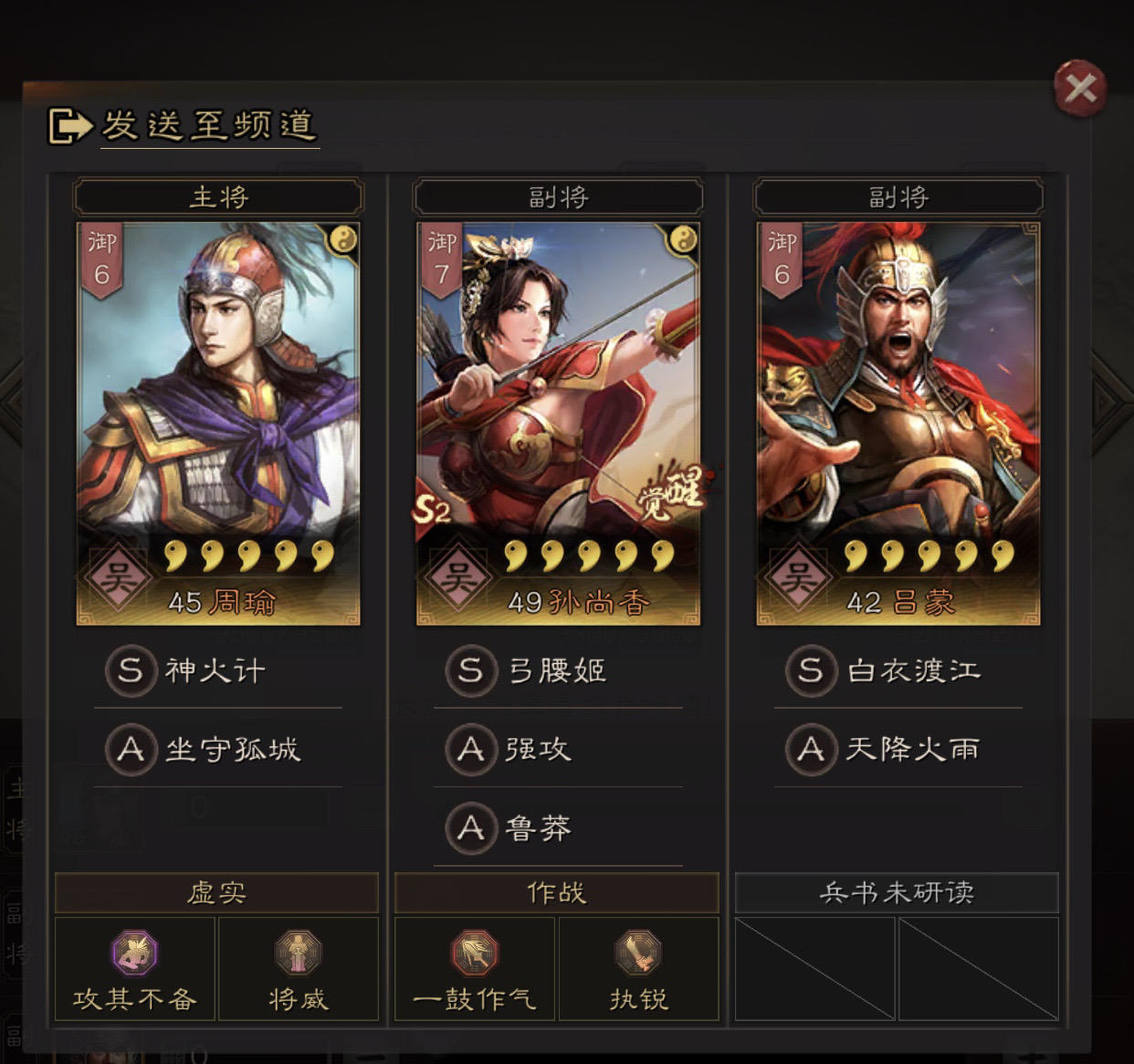 甘宁太史慈程普大蜈蚣S2能用么,没白马没折冲,现在是甘宁万箭避实击虚,太史慈弯弓克敌,吕蒙四面楚歌无当飞军