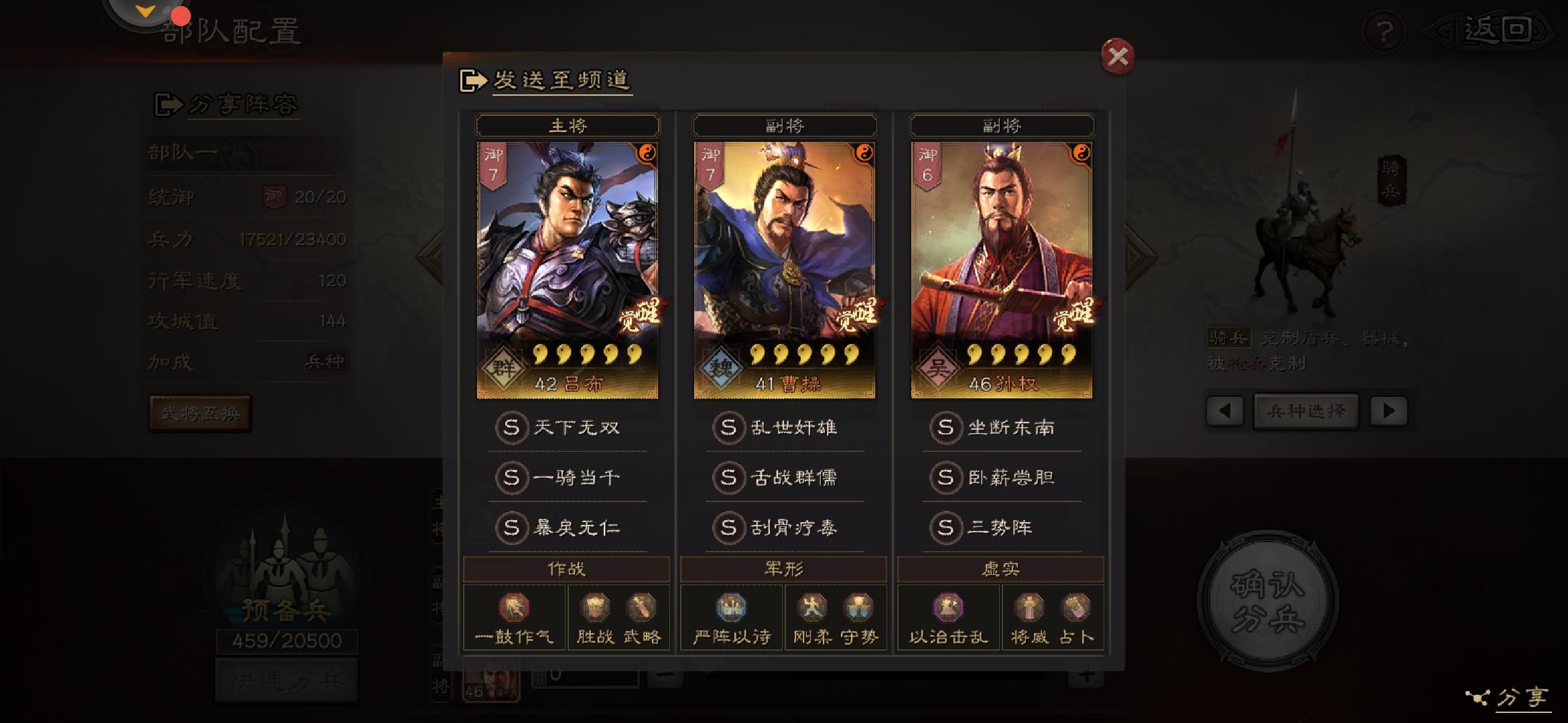 个人想法是关张赵一队虎枪,双夏侯加程昱一队骑兵,不知道剩下来的丞相和黄忠严颜能不能组一队弓,另外张角和司马闲置着也有些可惜...求大佬们给端详端详以下是将和S战法,A战法都有,紫将朱俊郭淮都有满红的