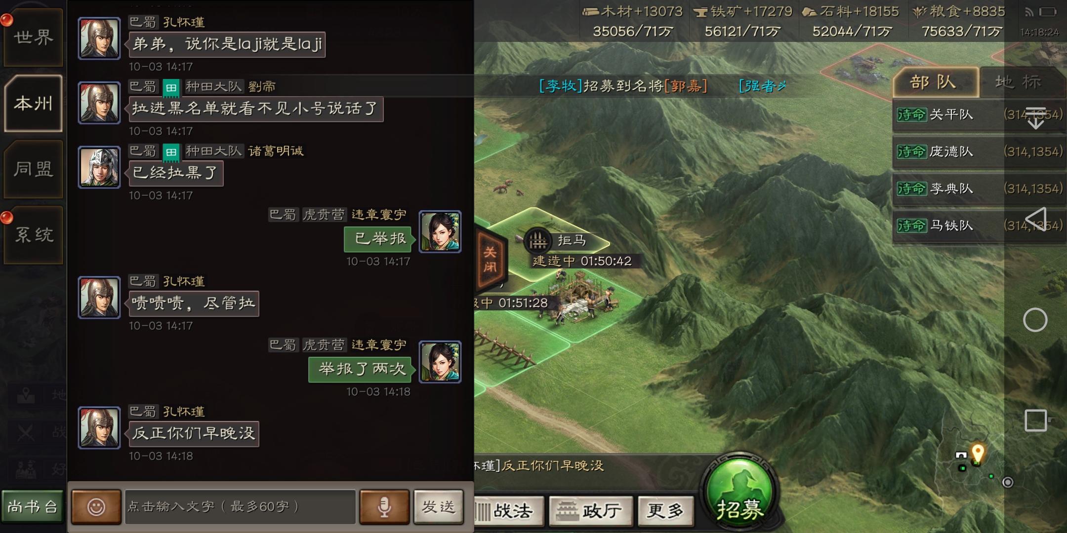 区域战,跑路太远了,打一次仗要跑5个多小时,遇到拦截,还自动打倒回府,这样还打什么仗,防御攻城都难,希望增加战道,只要占道铺路就可以增加行军速度,一不破坏平衡提高打仗也效率,二也可以增加攻城抢道的团战机制,不管是攻城还是支援都会很效率,增设驿站也可以提高战斗行军效率,要不然这样满地图跑太蛋疼了。