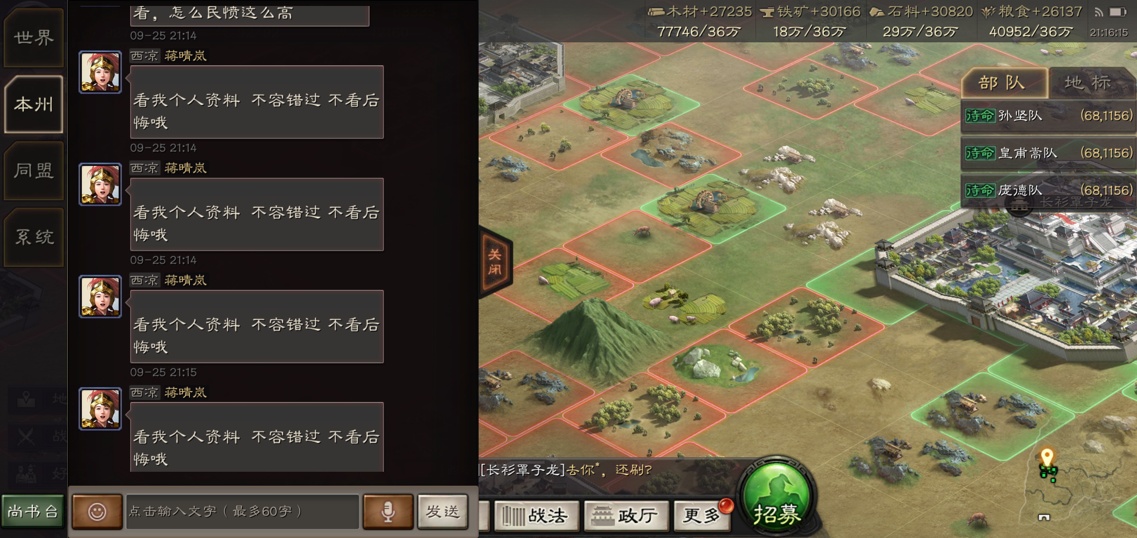 手机党可能发帖不是那么好,就文字党了。第一点地图功能。盟友一个盟的和友盟地图颜色一样让人难以区分。同盟打下来的城市可不可以地图就有标记不同颜色方便玩家调兵。第二点文字的和谐,就我都看傻了,没有这两个字也和谐,枪兵枪也和谐,如果你和谐你干嘛叫枪兵?希望能智能一点至于其他的问题大家都有提过就不说了,主要是地图功能希望策划能进一步加强,要不然这地图有什么用啊。我希望大地图做的功能更多一点,而不是现在