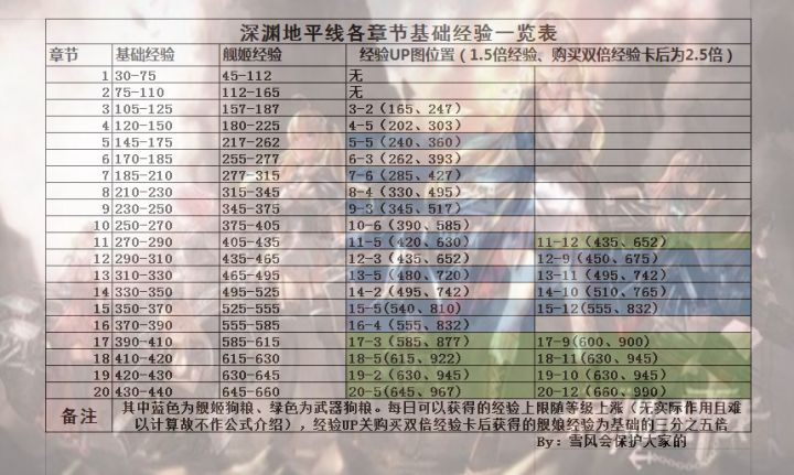 注:1.所有数据均以结算面板为准,此表仅作参考。2.经验up 图后括号内数字为:(屑提经验,舰姬经验)3.经验up图屑提经验以结算界面"基础经验"为基础经验标准。购买月卡后不使用双倍经验卡实际获取的经验值为该副本基础经验值的1.5倍。使用双倍经验卡后则为该副本基础经验值的2.5倍。4.经验up图舰姬经验以结算界面获取的经验作为该副本的基础经验标准。购买月卡后,使用双倍经验卡后,实际获取