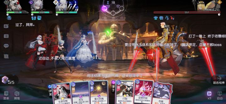 不是我吹,苔丝yyds!前排吸收伤害,配合苔丝打无力,一定要有无力,不然四回合直接秒,捏一手5技再群攻前抬血加盾,琳打输出,十几分钟基本就过了,不过由于阴间发牌员,这边建议多试几遍,第一回合必须是前排抗