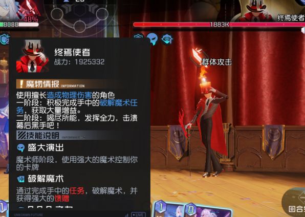 大家好,我是鱼丸(>ω・* )ノ最近真的是有超级多的小伙伴在问10-40该怎么过,恰好本次更新也下调了boss的难度,那么今天我将完整为大家介绍这个难缠的boss 终焉使者的攻略,一起跟着我来看看吧。Boss终焉使者:总血量:5618k,一阶段血量:1883K,二阶段血量:3735k一阶段:魔术师阶段在本阶段boss会使用强大的魔术控制你的卡牌,并附带难缠的额外效果。我们需要做的,就是破