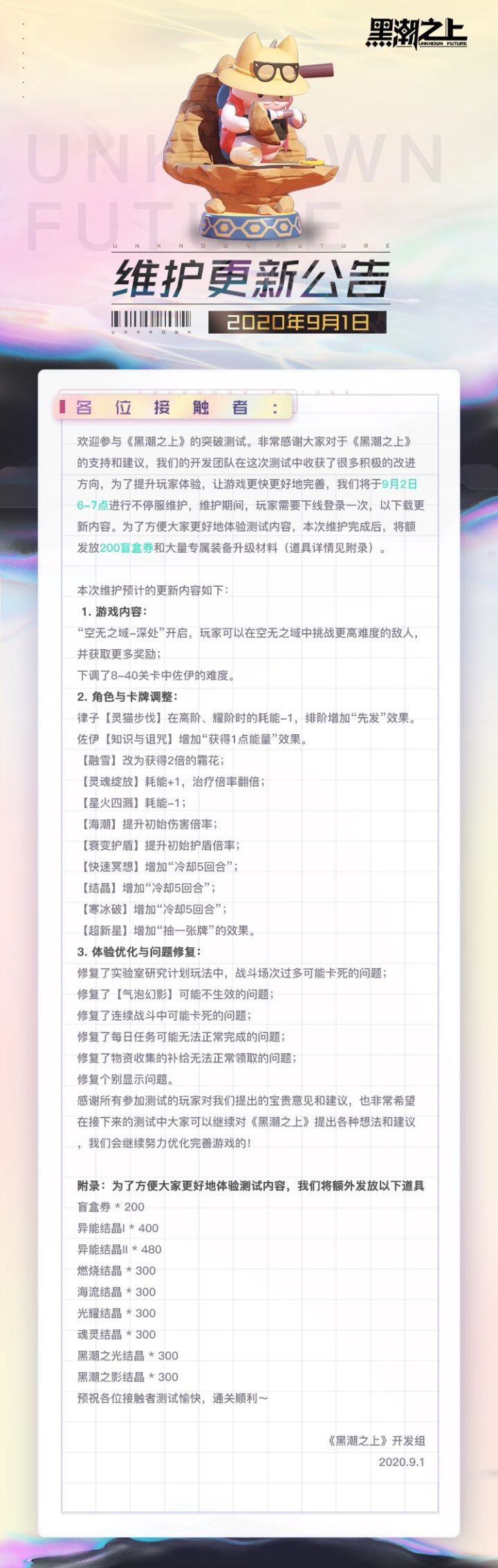 各位接触者,欢迎参与《黑潮之上》突破测试。非常感谢大家对于《黑潮之上》的支持和建议,我们的开发团队在这次测试中收获了很多积极的改进方向,为了提升玩家体验,让游戏更快更好地完善,我们将于9月2日6-7点进行不停服维护,维护期间,玩家需要下线登录一次,以下载更新内容。为了方便大家更好地体验测试内容,本次维护完成后,将发放200盲盒券和大量专属装备升级材料,敬请点击图片查看详细维护公告。