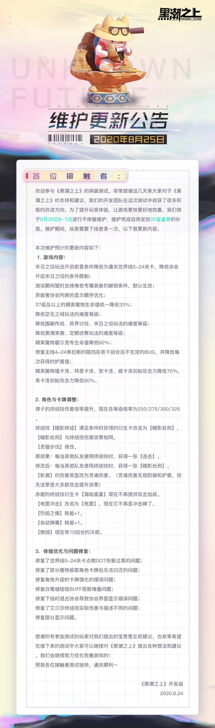 欢迎参与《黑潮之上》的突破测试。非常感谢这几天来大家对于《黑潮之上》的支持和建议,开发团队在这次测试中收获了很多积极的改进方向,为了提升玩家体验,让游戏更快更好地完善,我们将于8月25日6-7点进行不停服维护,维护完成后将发放20盲盒券的补偿。维护期间,玩家需要下线登录一次,点击下方长图获取更新内容。