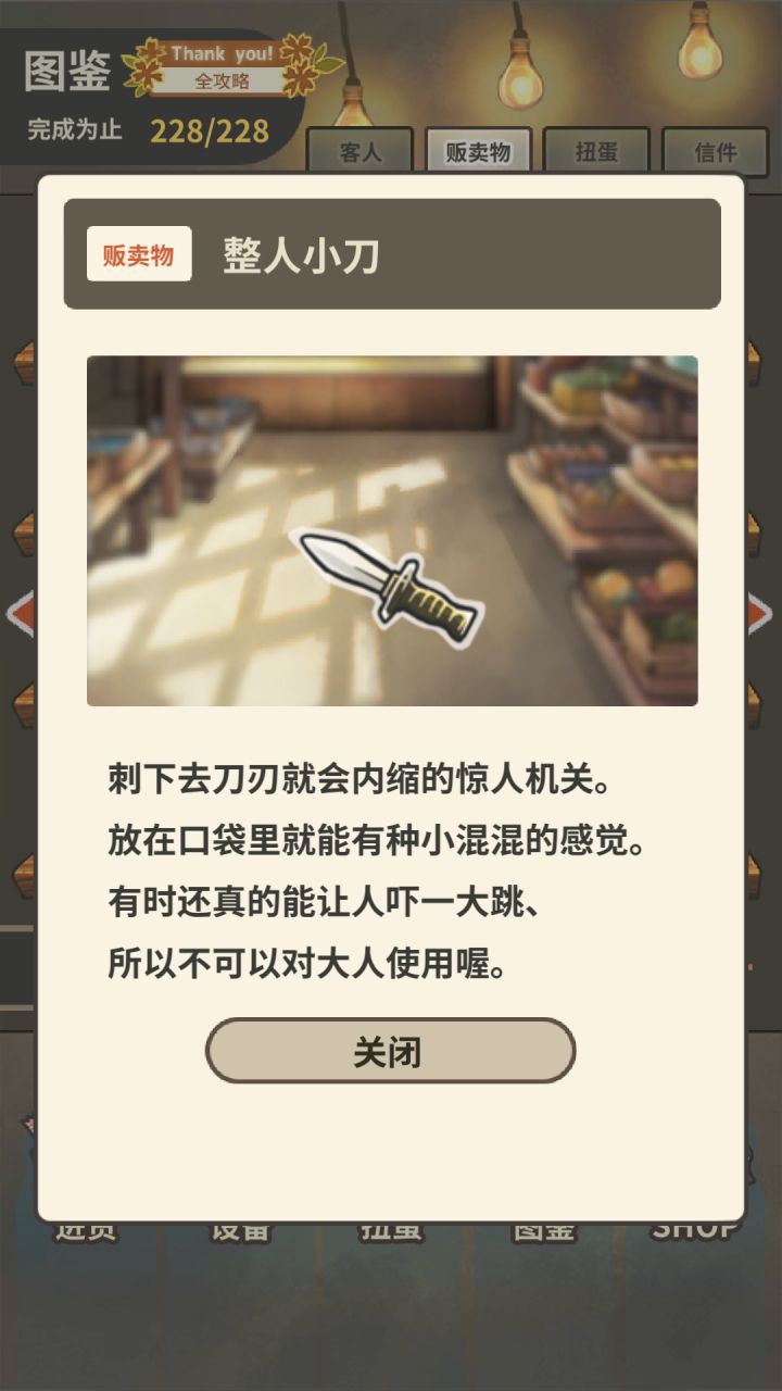 内含剧透,还请慎入(内含整人小刀得法)(所有图鉴已追加)一直处于佛系的状态 ,大概玩了三个星期吧。对于昭和游戏,很多人想到的是温暖吧。我们先来看小刀的得法。其实很容易。每次电话铃响会接到一个任务。等积累到一定程度后,就会出现“完成20次其他任务获得小刀”的特殊任务。一玩法一1)如果说是玩法的话,简单来讲就是放置,偶尔看一眼就好,像这种拒绝了无休止点点点的游戏真的是太温柔了。2)如果问有
