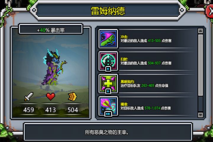 大家好,我是昵称,这期给大家带来的是关于合成金宠「雷姆纳德」的PVP实战测评。 基本介绍:「雷姆纳德」作为合成金宠,自带40%暴击几率属性,和1sp切后技能「扫射」让他成为一个对敌方后排威胁极大的金宠,同时不低的出手速度和血量让他拥有了在后排抗伤的能力,并且1sp的回复技能「黑暗契约」足以保护队伍中的主力输出点,其四技能2sp「精准」对于敌方中间位置输出宠物也具有一定威胁。基础打法:在pvp中