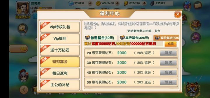 理财基金类似于其他游戏的等级基金,同样是购买基金之后到达一定的等级可以领取一些游戏内的货币。相比于其他游戏的等级基金运筹三国的理财基金可以算的上是诚意满满了。因为他的基金是可以叠加的。比如你买了1000的超级基金那么你不但可以拿到普通基金(3000钻石返利),而且还能拿到高级基金大于32800钻石的返利,以及100000钻石的超级返利,简直不要太良心。如果想要深入玩这款游戏的话,个人建议充值10