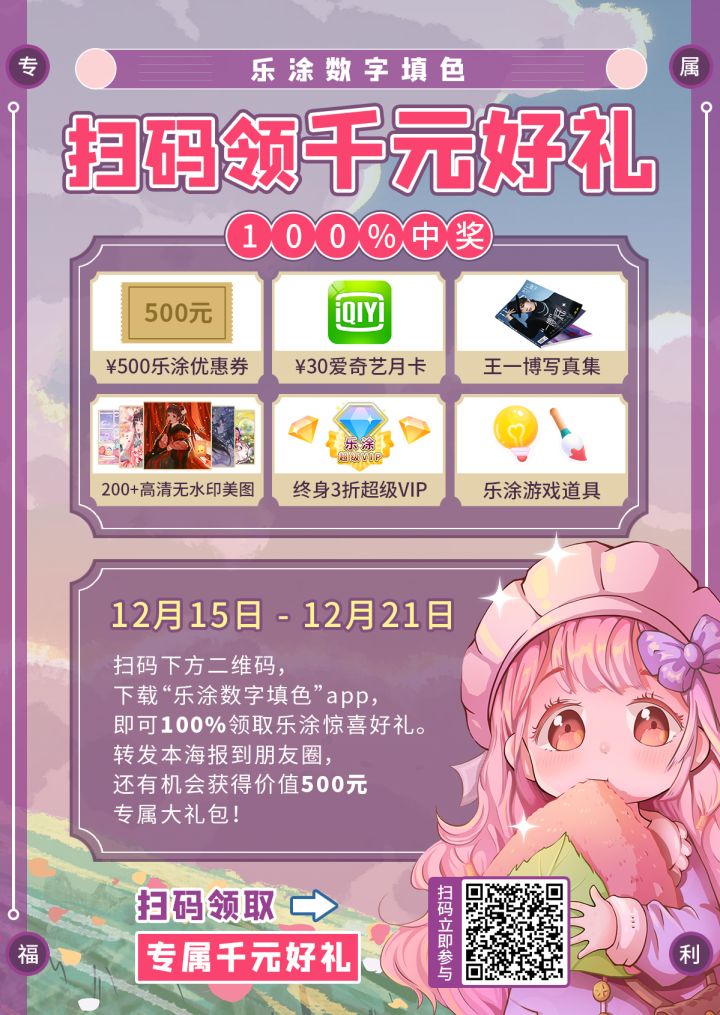 又到了每个月的乐涂宠粉日了,这次依旧是福利满满哦,人人有礼~ 转发还可瓜分1000元大奖! 500元乐涂优惠券、爱奇艺会员、王一博写真集、终身VIP、超多游戏道具…… 快来参与吧~