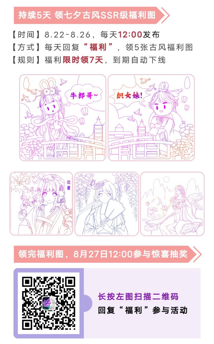 5张SSR级稀缺福利图,七夕免费送!还能赢百元签名漫画书、钻石、红包!赶快前往我们的官方微信公众号【乐涂数字填色】参与吧!1.领取福利图:2.参与抽奖活动:8月27日中午,到公众号回复抽奖参与