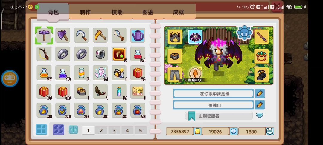 总共刷了两个小时,每种掉落物大概有10组。我主要是刷甲壳,用来做石砖路,如果有小伙伴缺地板的话可以从50层~60层,重复刷就可以了,顺便还能升级战斗等级。
