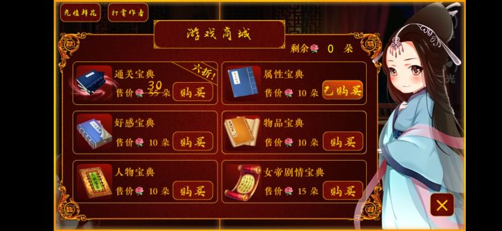 呜呜呜,真不容易啊,复活到没钱了,返回进度一遍又一遍,拒绝了好几个表白的,终于拿到皇帝好结局,最后看到后宫佳丽三千,只取一瓢饮还是很感动的,有种努力没有白费的感觉,最后结局的时候那个音乐也很有感觉!很棒棒
