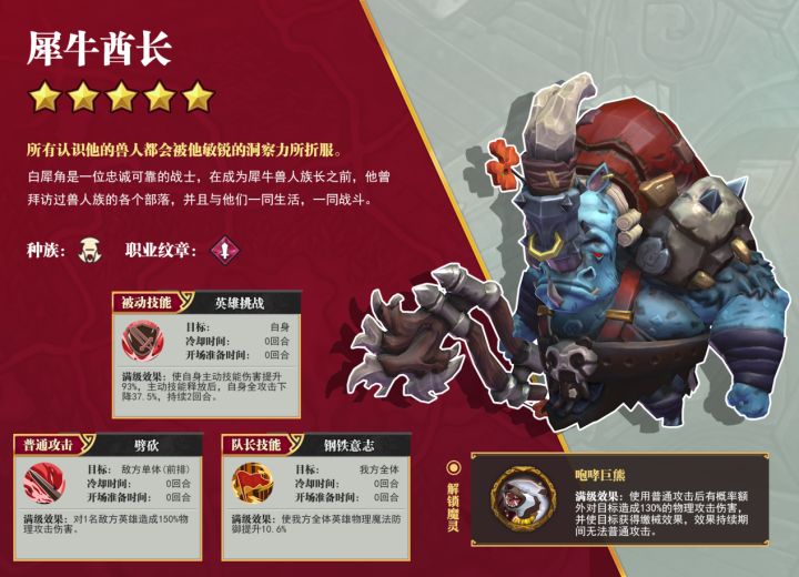 兽人族的特色在于给敌人挂上重创效果后,利用主动技能在前期超高伤害数值,配合队友自带技能和魔灵技能的各种加成,一波核弹把敌人带走或打残,如果脸好能触发暴击,可能看到出手躺2人的局面,从而在开局就获得巨大优势。英雄属性:犀牛酋长在攻击上是极端强的属性,144的初始值,2.8的成长无可匹敌。灵巧也不低,属于中等出手速度,精神和坚韧也不是脆皮。因此从属性上看犀牛酋长是一个四维很顶尖的英雄。专属技能: