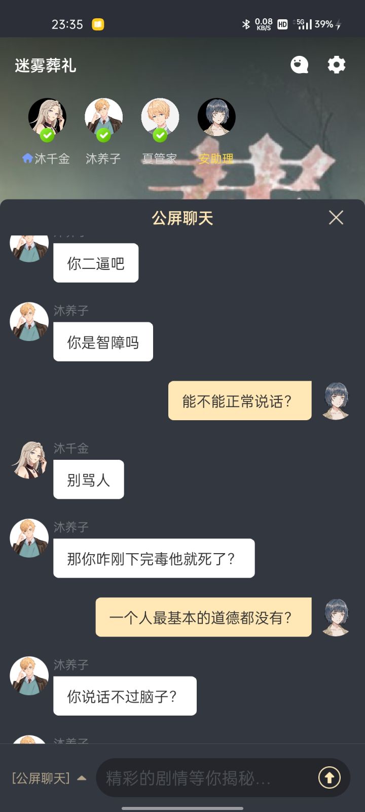本来看到有一些大佬说什么这个游戏的环境很拉胯,但也有很多人说什么都是萌新一起加好友一块玩,的确我已经玩了三把包括教程,但问题就在第四把上,一开局的自我介绍就开始了,我刚介绍我是助理,那个玩家就开始叫起来了,说着什么:别几把助理了。那时候开始就已经有点烦了,然后这一环节就被跳了。在之后我下毒中途在冰箱打翻冰格弄湿了衣服,他又开始说些什么你上厕所上到身上了之类的。其实已经很生气了,但想着还有别的两个玩家,这游戏总要先玩完再说,就当作没看见。但就在第二章,他在死者死亡前半小时去找他,十五分钟后回来,再过了十五分钟就死了,我去问他你在这段时间里做了什么。他反倒生气了,一个劲的骂了起来。我是很生气,但还是保持这一个正常人理该具备的基本素质。中途他两次质问了我为什么下毒,一个劲的说我是凶手,但我早就解释过了两次了。在线索里就有,我所下的毒是两天后发作,而我也很明确的说我就是想杀他,但被人抢先了,我的毒是两天后发作的,他就全然当做没看见,选择性忽略。也就这件事发生之后,我只能表示这游戏环境有待提升,好好的玩个游戏,想着放松自己去的 反倒弄的自己心情不好。😤😤😤