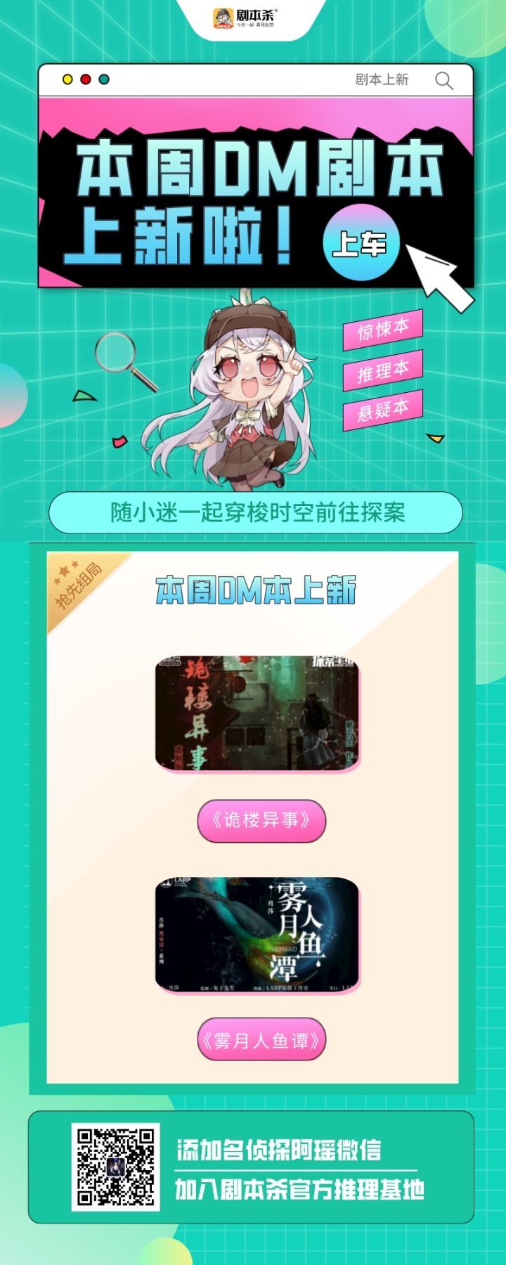 🎡本周DM剧本上新预告👏来《剧本杀》,揭秘传说的真面目!🎭DM剧本《诡楼异事》 🌟标签:现代 剧情 惊悚🎭DM剧本《雾月人鱼谭》 🌟标签:童话 悬疑 推理#游戏安利#剧本杀#线上打本#推理
