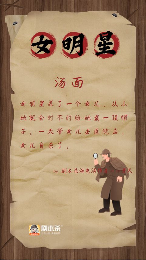 Hi,各位神探们,今天小迷请来了海龟汤作者——景天出了一道题,来考考大家的推理能力~快来猜!汤面:女明星养了一个女儿,从小她就会时不时给她戴一顶帽子。一天带女儿去医院后,女儿自杀了。评论区留下你的汤底哦,2022/10/18公布答案!