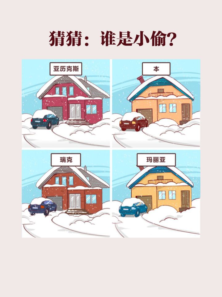 Hi,各位神探们,今天小迷又想出个谜题来考考大家的推理能力~看图猜题☟你们猜出谁是小偷了吗?