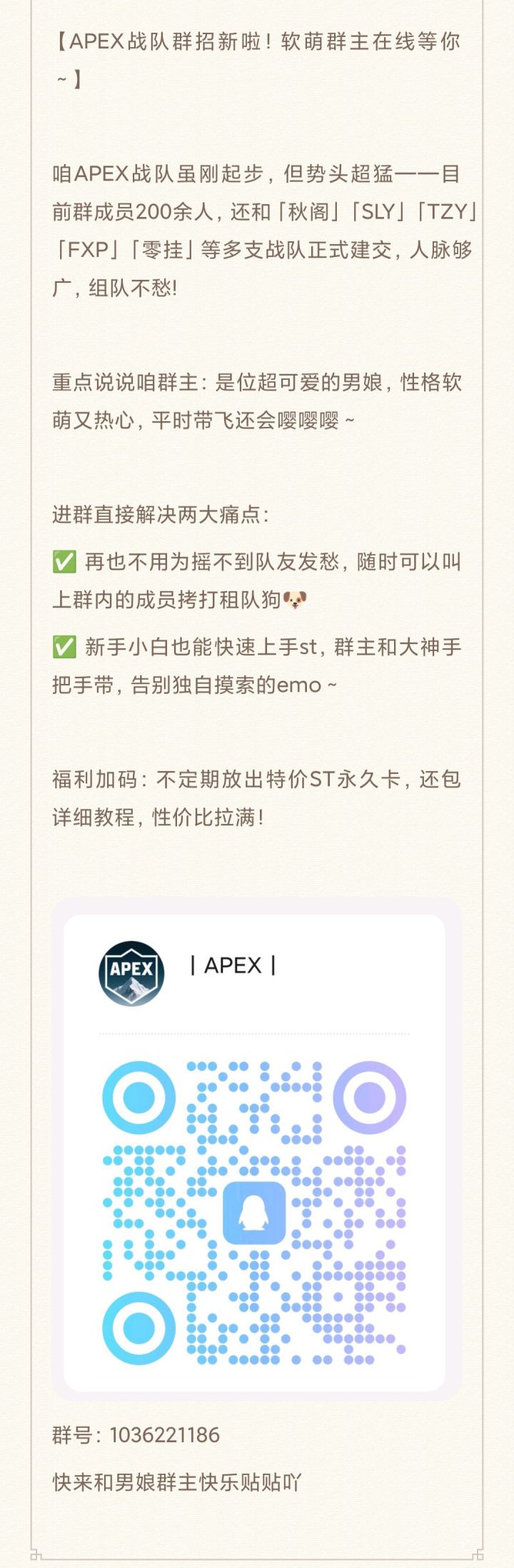 【APEX战队群招新啦!软萌群主在线等你~】 咱APEX战队虽刚起步,但势头超猛——目前群成员200余人,还和「秋阁」「SLY」「TZY」「FXP」「零挂」等多支战队正式建交,人脉够广,组队不愁! 重点说说咱群主:是位超可爱的男娘,性格软萌又热心,平时带飞还会嘤嘤嘤~#重装上阵 进群直接解决两大痛点:✅ 再也不用为摇不到队友发愁,随时可以叫上群内的成员拷打租队狗🐶✅ 新手小白也能