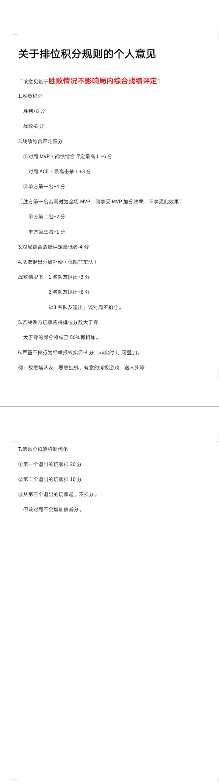 (意见如下图)按现有的加减分机制来看,实际上是不怎么能激起玩家冲榜的乐趣的,而且即便是正常的输赢也非常容易摧毁玩家的心态。例如:摸鱼不干事,赢了,加分。累死累活拼命打,全场数据第一,但队友**,输了,减分。这不就是“奖懒罚勤”吗?所以就有了这个《意见》。注:每一条单独积分。有特殊说明的,根据其条件是否符合情形再判定。