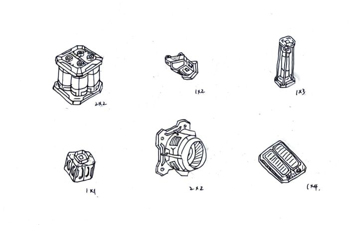 模式特点:战车所需要消耗的能源,弹药等物品都必须通过收集才能继续生存下去,在局内会有一到两次沙尘暴,此时的天空会变黑,能见度极低,需要探照灯辅助前进,沙尘暴期间不能用太阳能发电,且行动速度会变慢。模块介绍:(顺序从左往右,从上往下)①大号能源电池:可以储存大量电量,供战车的动力使用,血量较重装魔方少②远射探照灯:可以提供局部的照明,亮度高③范围探照灯管:可以提供四周范围的照明,亮度较低④