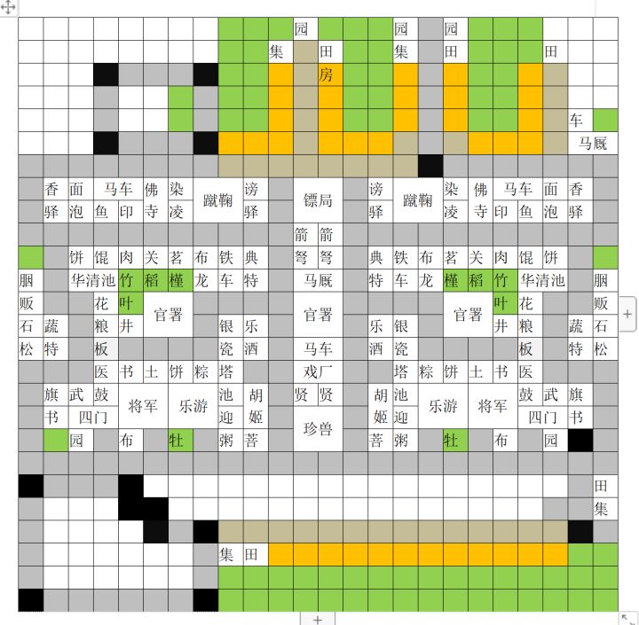 用的一个大佬的板子,确实厉害,玩完一周目了,这里建议萌新第一周目结束后新开一个,不要一直打下去,这样经济真不如几个周目后,来的快。绿色没写字的,种啥都行,最后都要换成竹子,大士人5级之后,要在家门口前面铺石路,改建房子,改完之后要换回花石路,收益高。还有就是后期所有都是大士人个,改完房子后,可以改几个才能高的做匠人,发现工艺品。最后,图我留下了,加油(ง •̀_•́)ง。补充:图中金色的路是木