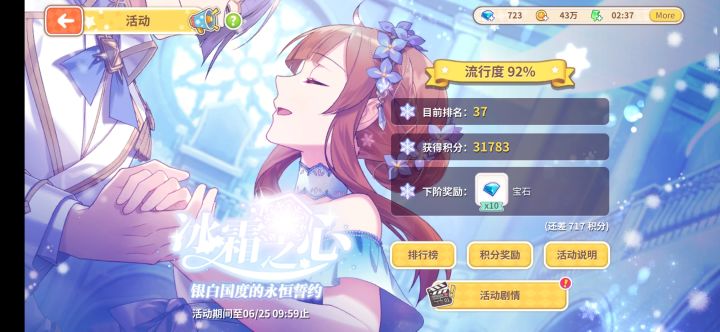 这个活动其实没那么肝1:开活动我现在体力上限开完190,架子7个活动开始时,这些能卖(无流行):190*10+3*10*20+4*9*20=3220这3k就要让别人追会了2:流行度先前攒了30多票子去抽的我。。。大概到了80+平冲一般是能到2-3%的。重点还是准备不充分3:中途活动奖励体力直接用或者攒到流行度高再用,活动最后冲一下也是一个选择非常前排。。emmm这个是某不知名