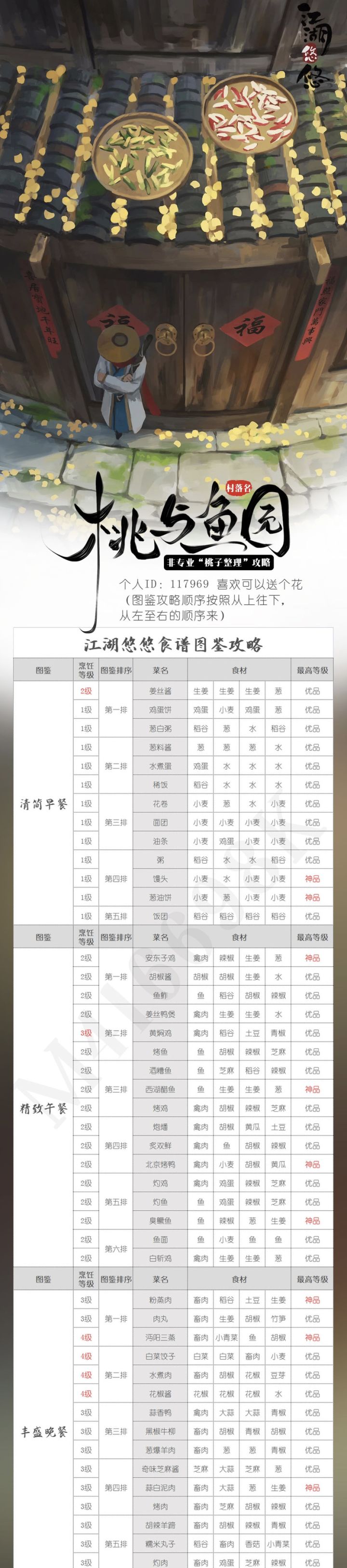 当前更新图鉴:清简早餐、精致午餐、丰盛晚餐、养生滋补、家常小菜、面面俱到、面面俱到、堂食正餐、风味小菜、一品汤羹、年年有余、瓦舍小菜、地道小吃、酒肆肉食(欢迎补充)【美酒、丹药等其它攻略】可到此链接下载:(高清原图攻略也可以下载)一张图解决所有。https://pan.baidu.com/s/1bh1O4Fe9SXjhwh00S0_zTw提取码:jhyy
