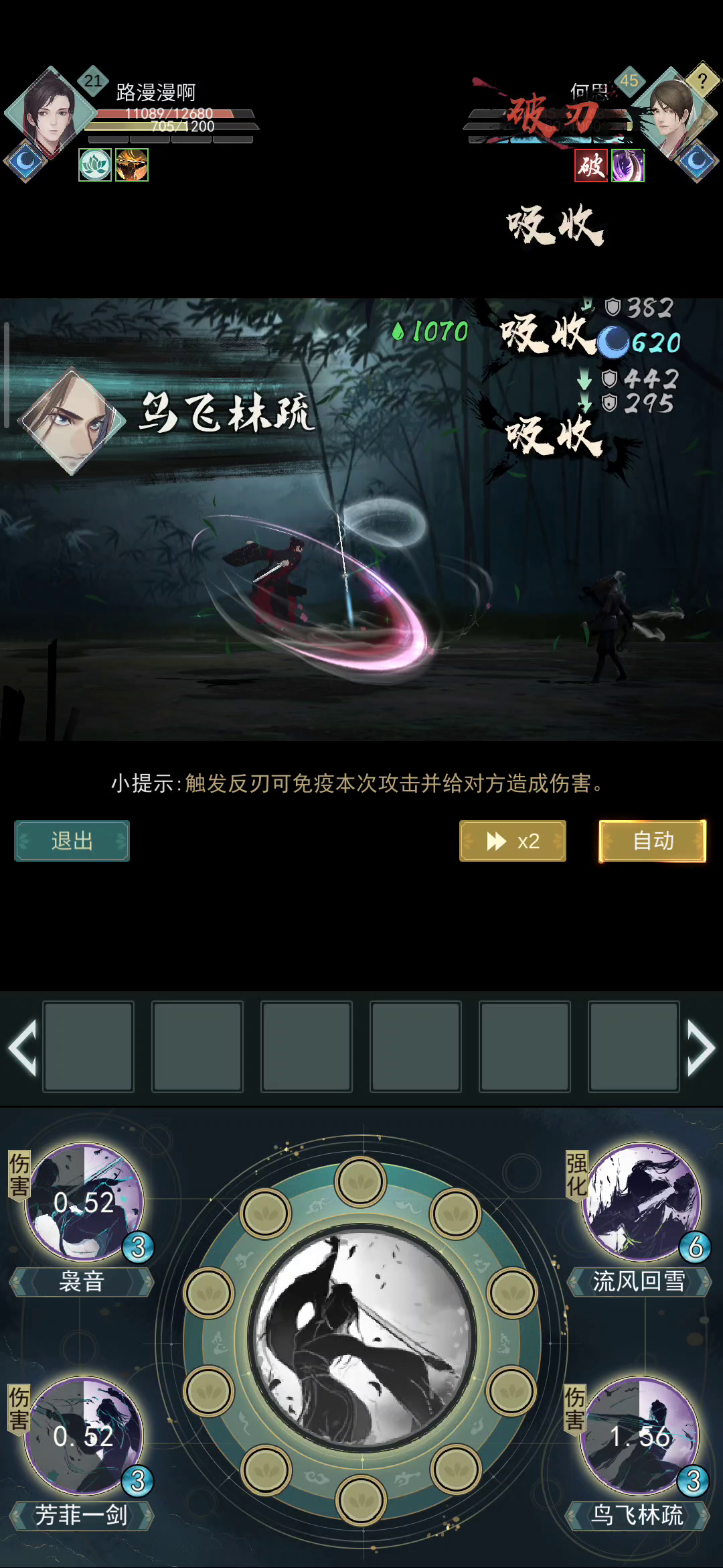暴击伤害150% 有时候会算洞察 所以实际伤害有时候经常回到200% 而要破1000定需要4.5下普攻加4.5下回复的4点剑意打的伤害 也就是4.5*107+4.5*4/2*53+初始4点剑意=481.5+477+106(初始)=1064.5 毕竟是计算理论所以稍微严谨点 这里就可以不提反刃了 毕竟反刃可以理解为无敌加强铁璧技能 如果反刃到斩云还好 反到破106以上定力技能时 我们实际攻击次数就要调整 因此就用4.5来计算