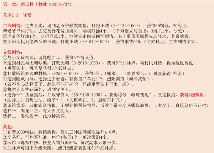 第一章一共有三关,很多玩家还不知道要怎么完美通关,下面就为大家带来江湖悠悠探索侠道西瓜村全剧情完美通关攻略。第一关:守候第二关:行侠第三关:寄信重要提醒:①崽子出行是不能挑战关卡的。每个关卡限时60min。每天最高可挑战3次关卡。主线通关了即可挑战下一关,支线任务是不影响的。侠道内每回合血量是不会自动回复的,但是可以去医馆恢复50%气血,每回合仅限一次。目前1-1、1-3是可以完