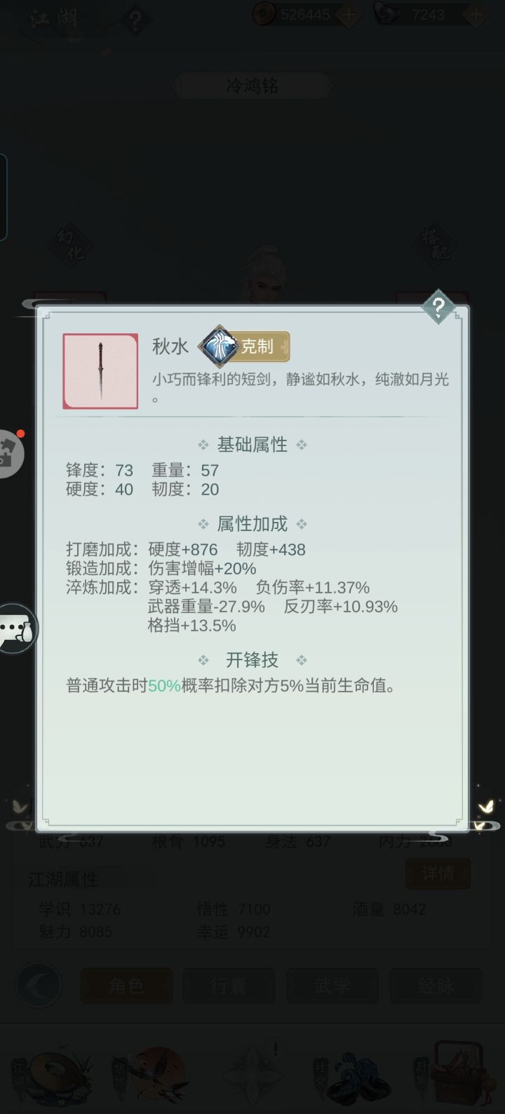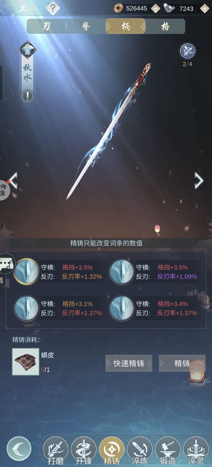 因为一般攻略里的疾风骤雨、秋水瑞荷等条件我都满足不了,所以我别无选择只能另辟蹊径。没想到还真给我摸出一条路子。 轴为:流风回雪-光阴劫-影子替身-光阴劫-魂灭斩剑用秋水,我自用的是红莲,一级即可。坏死要有,橙色玉就行。精铸洗八负八反。能全红自然最好,我自己是两部位全红。 剑式为四凌波+二魔刃,没有四凌波的话,四太极应该也行。经脉最好开局7豆或8豆。 凤澜的BUFF不选反刃和回血,其他的刚好满35。