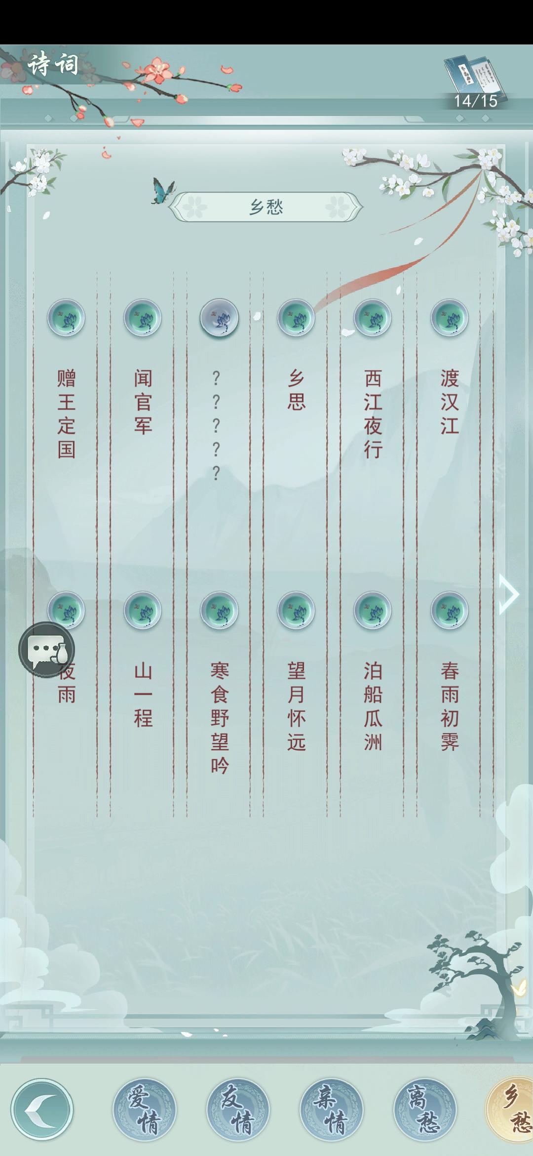 乡愁诗,就差一首了。连续跑了两周的荆州还是没出我都怀疑是不是跟酒的等级和品级有关。我一般11级酒出行的。