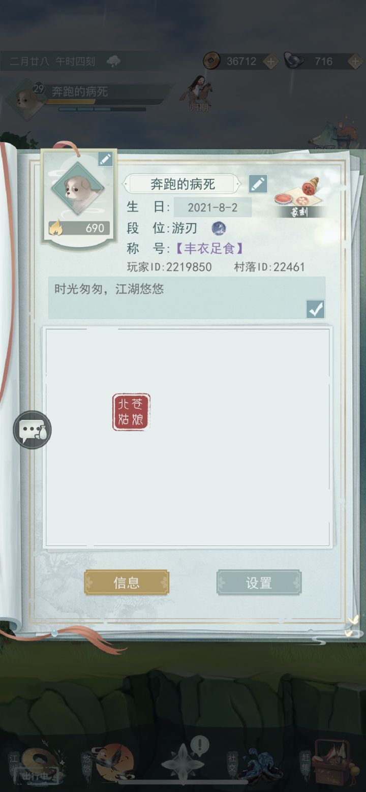 每天撒撒铜钱吃点好吃的送花花都可以!已经玩了半年多了,暂时是不会退游的,所以不用担心玩着玩着人没了,萌新和大佬都可以耶。啊对了,如果你暂时没组织的话,七侠和满级村子也欢迎你来!其实也不用多么热情多么要好,只要长久平淡的一直在就很好。