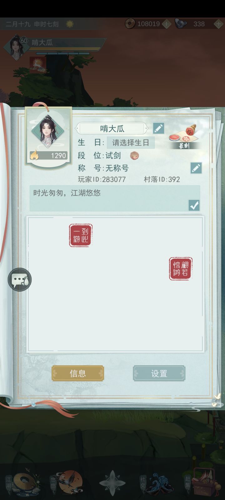 村ID:1223招人啦,满级村,东西有就送,商店自己随便抢,缺四人。来的直接申请,或加我ID:1722481。另:七贤收一个人。