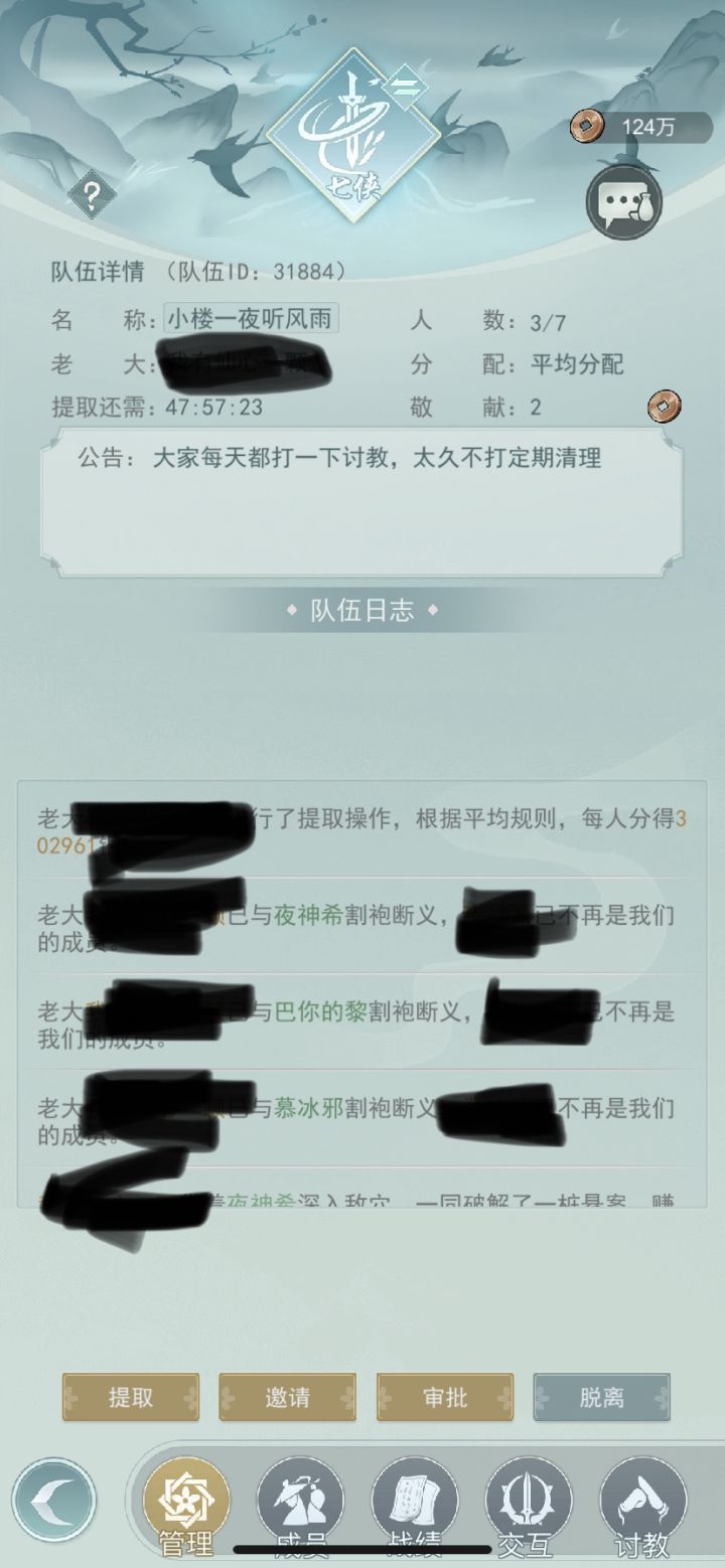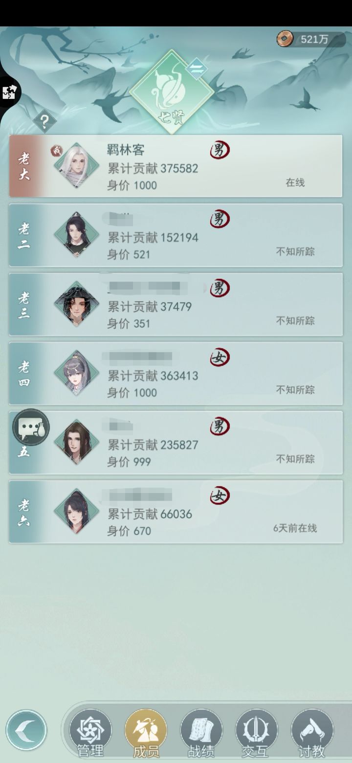 招人招人40级以上都行,只要讨教每天清掉就行,差的几个是之前没打讨教的被踢了,给提醒了很多次都不打。只要讨教清掉就不会被踢,敬献定期提取,本人id1584461这是现在打的领教值