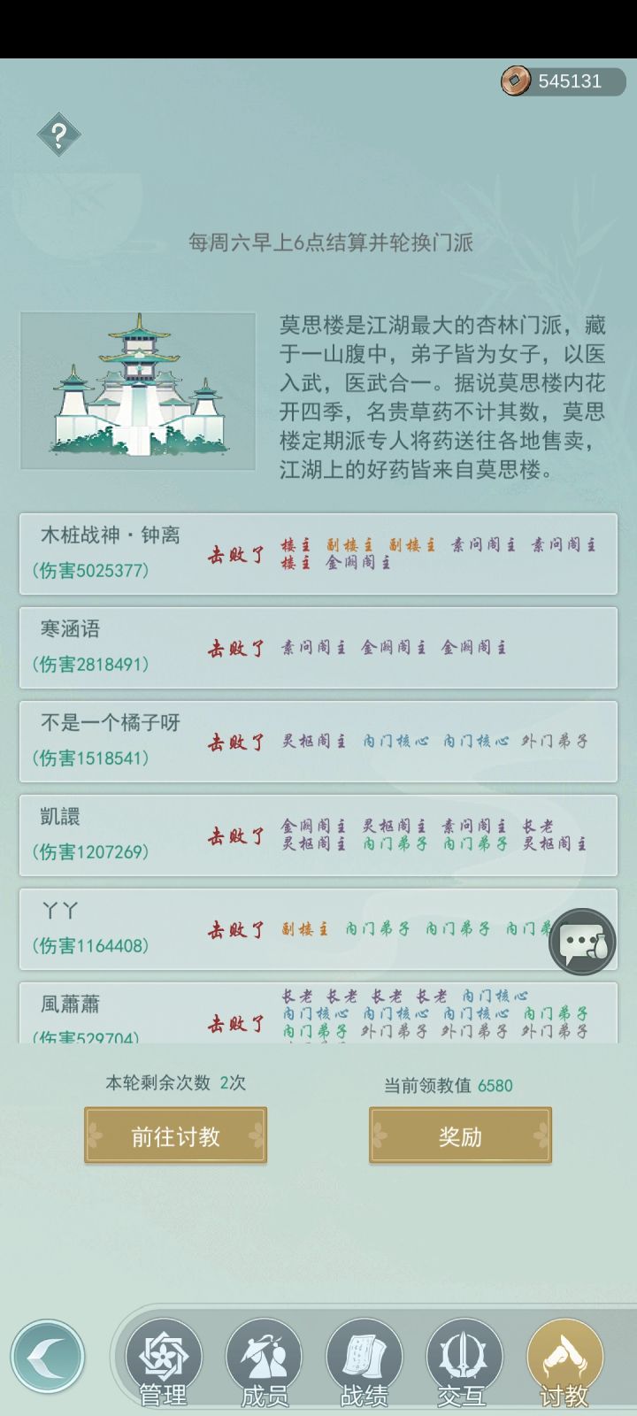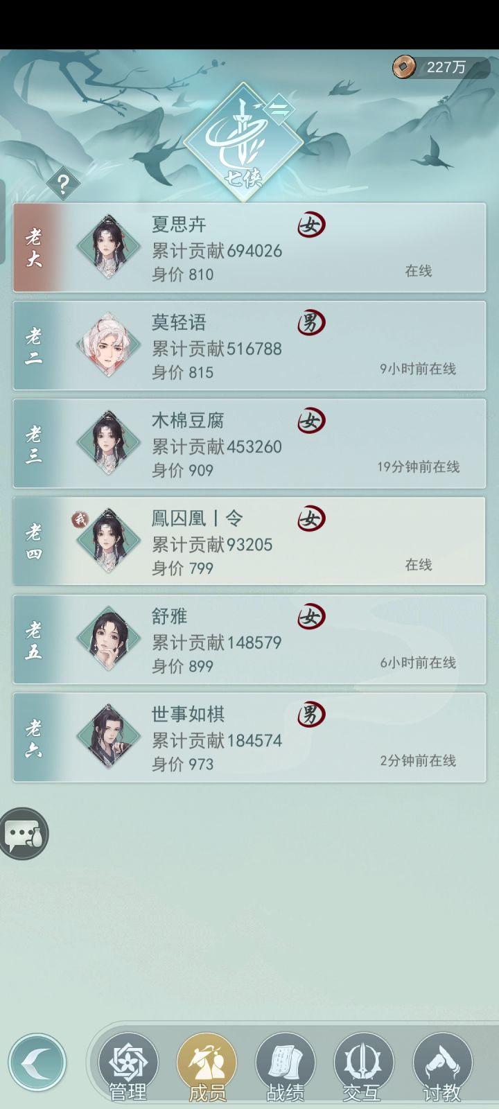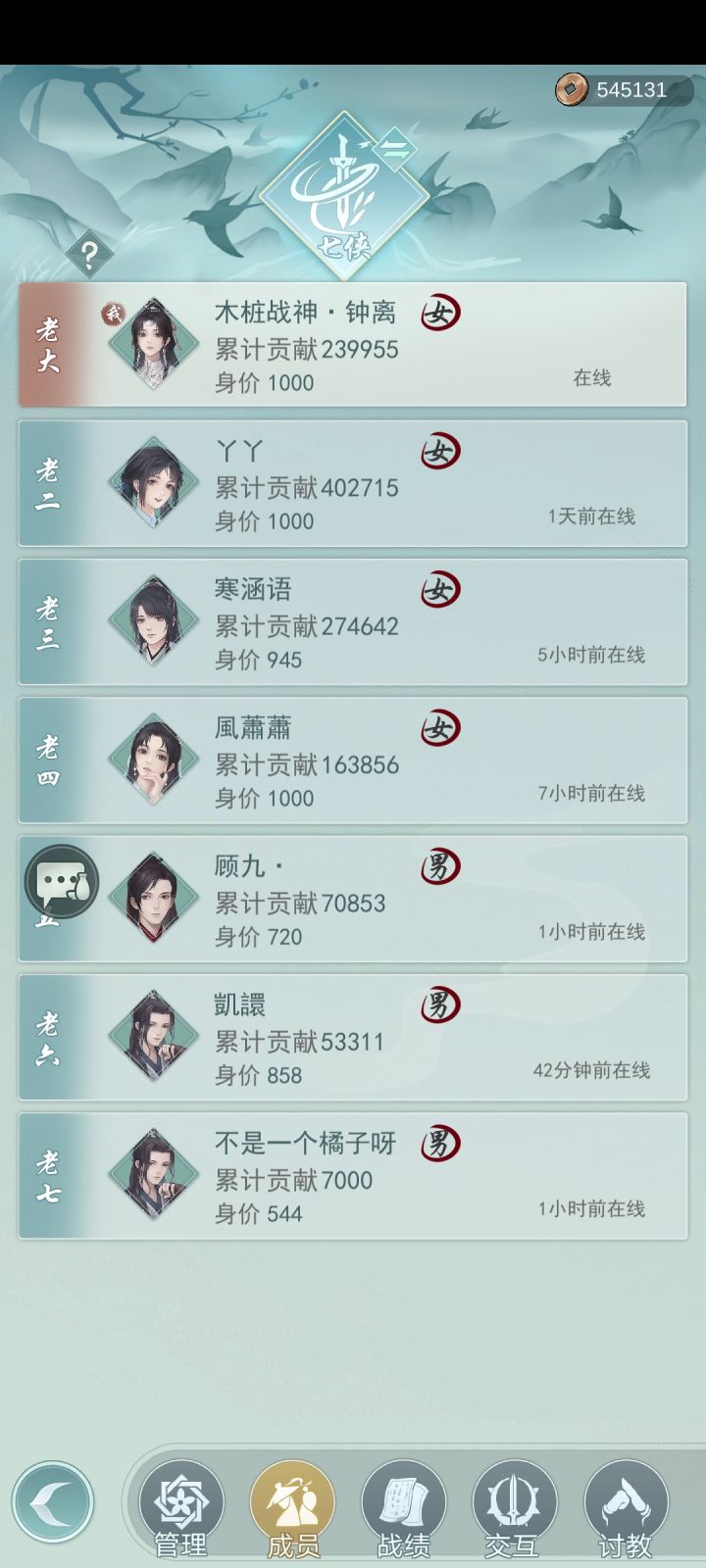 七侠缺一人 只要求等级40+ 能够稳定在线 每天讨教次数摸完敬献每周六结 讨教周均6600+ 长期离线会被请离 加好友195518拉
