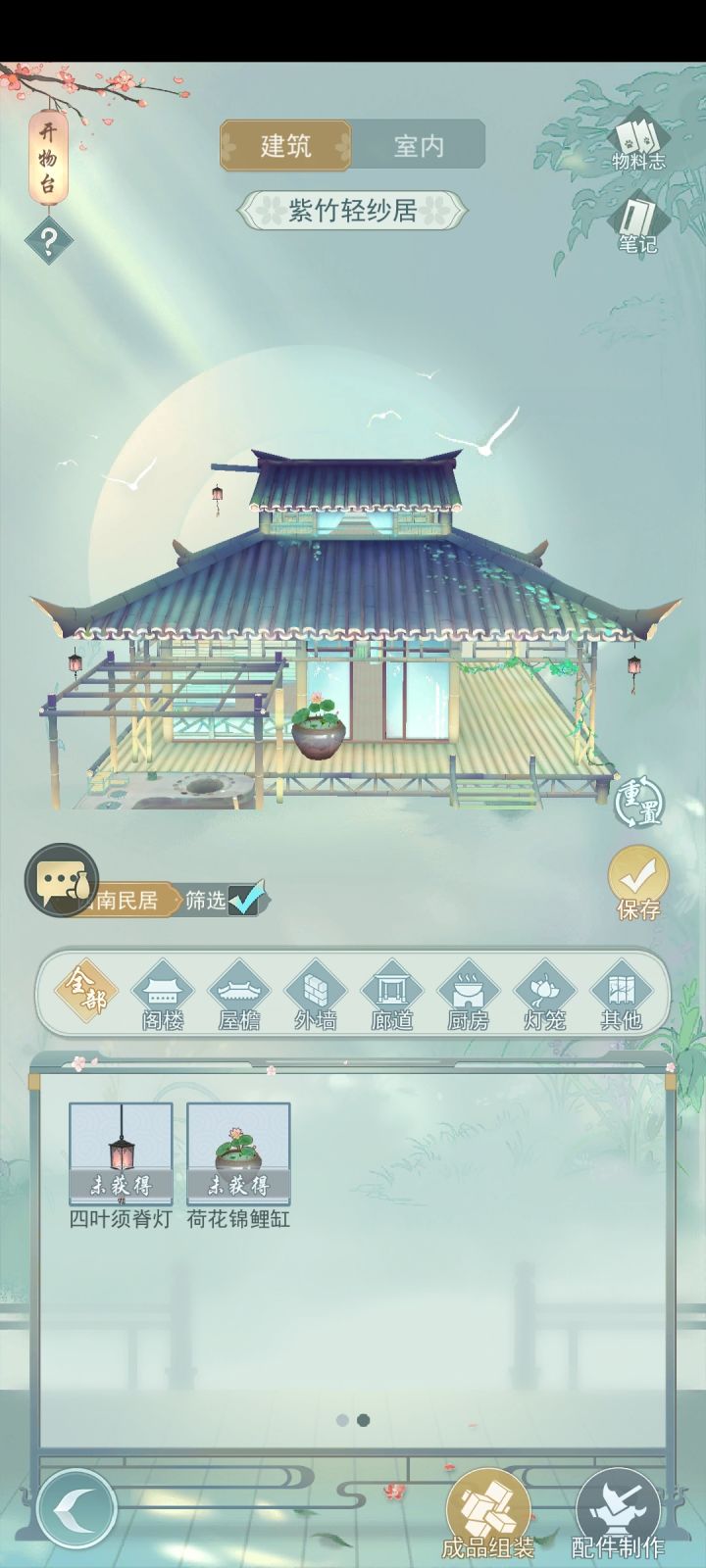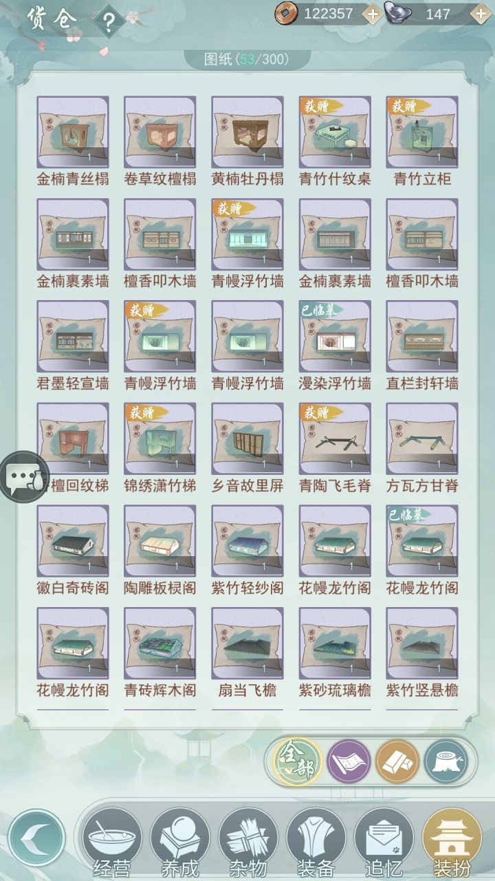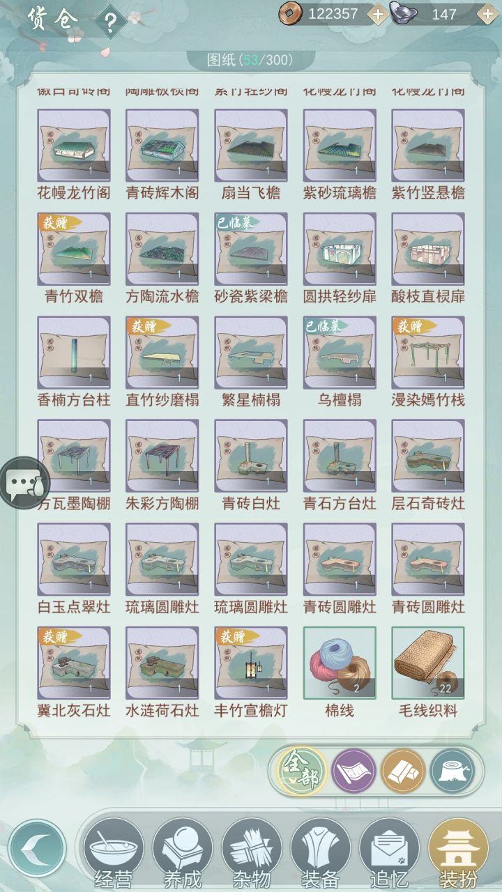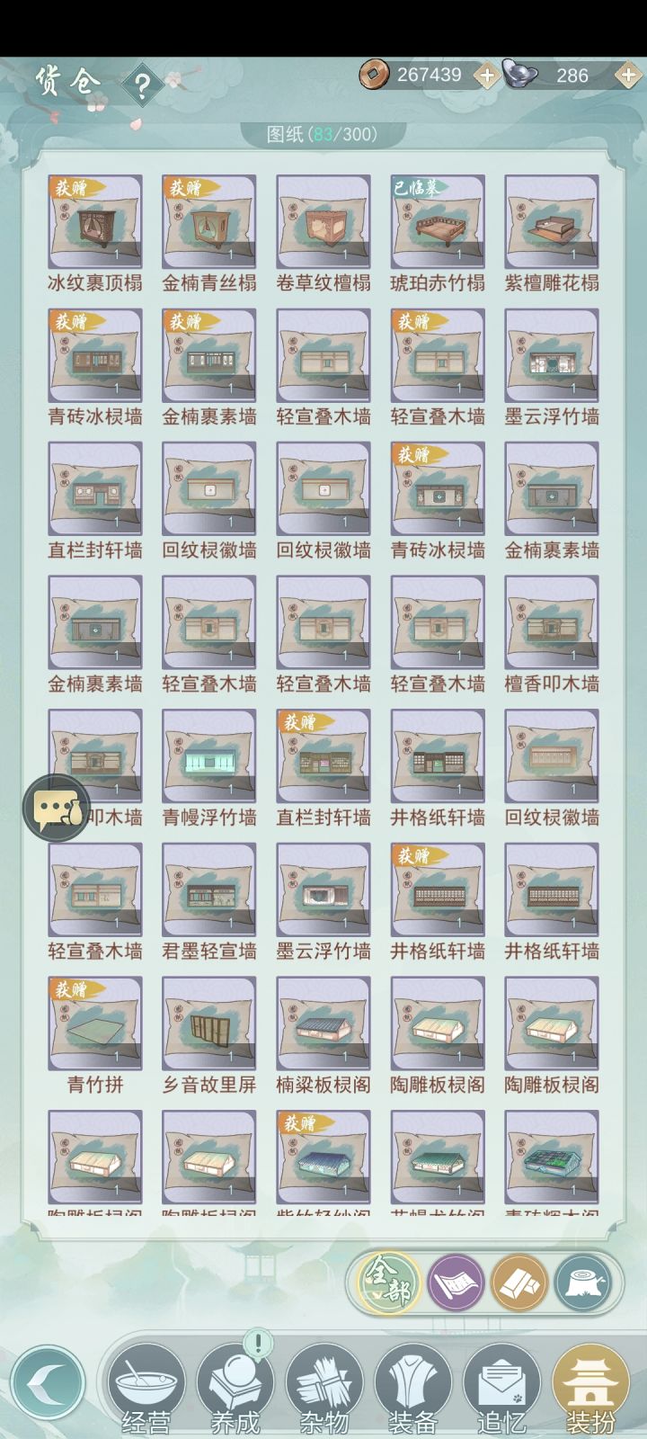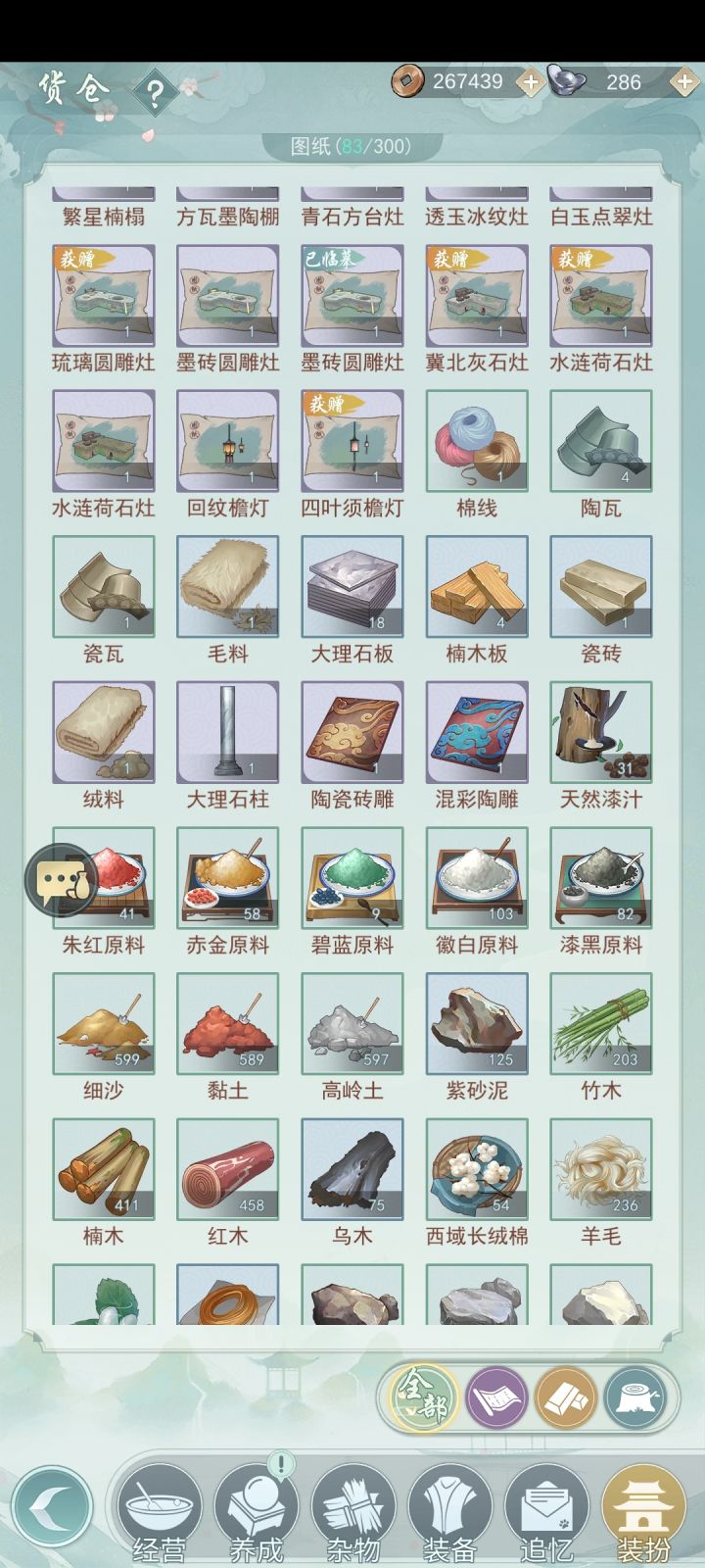 换我没有的图纸。墨蓝洒青柱、碎岩流水台、赤柱卷月案、映霞檐灯 可多换一