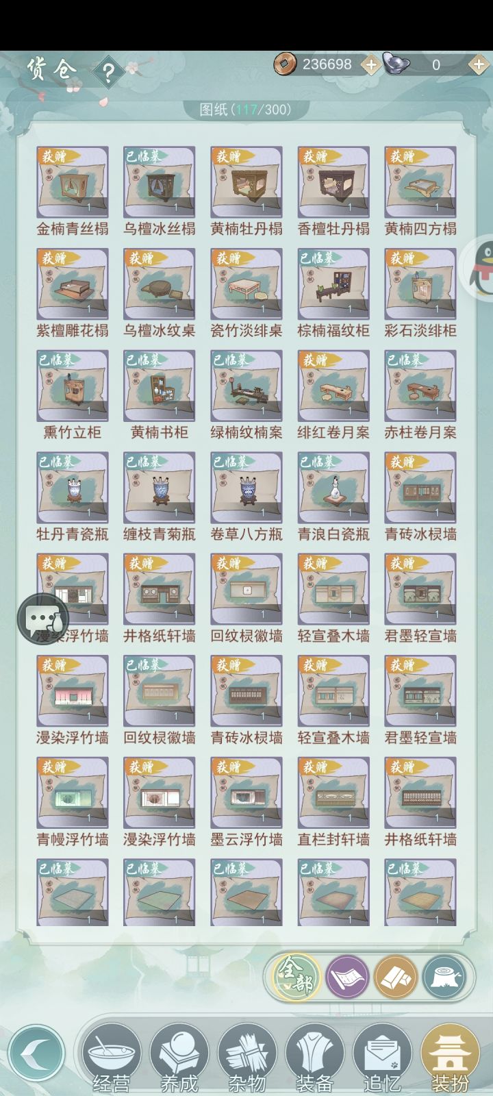 换我没有的图纸。墨蓝洒青柱、金祥红檀柱、映竹迭迭毯、碎岩流水台 可多换一PS:上限了。可以留言,能换的话有次数会回。