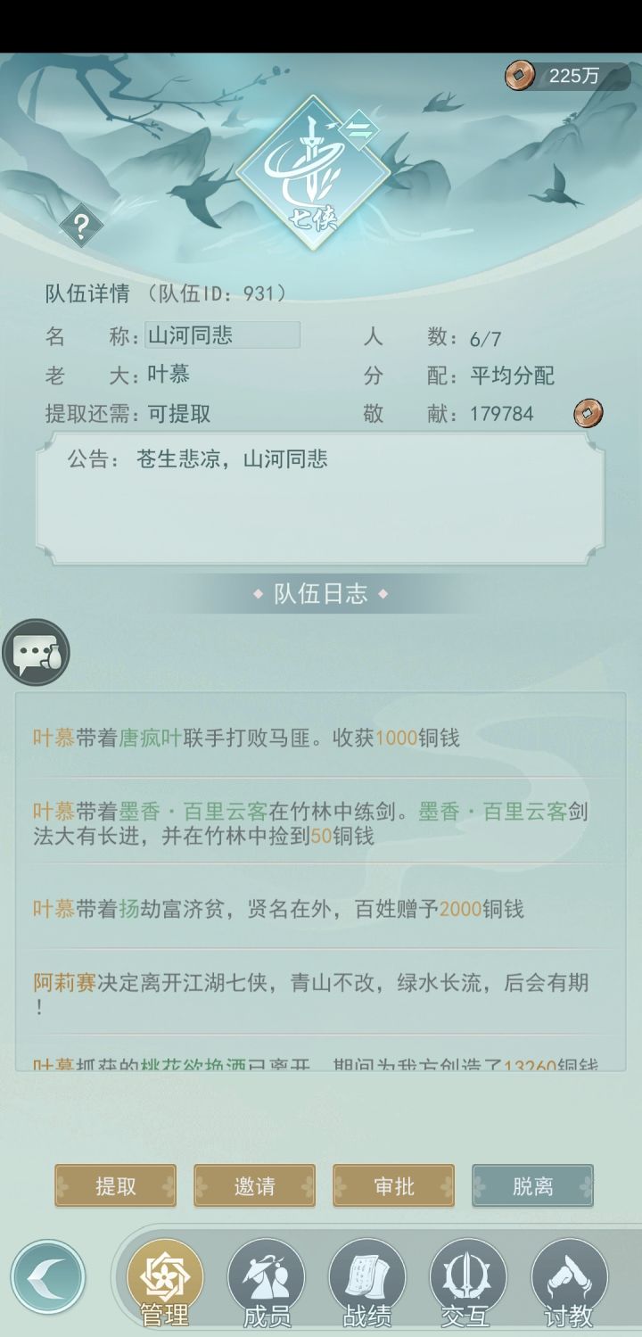 队友走了~,上周4人讨教只有7100未能打满,希望新队友可以清完次数,门派等级随意,队伍ID24,直接申请~