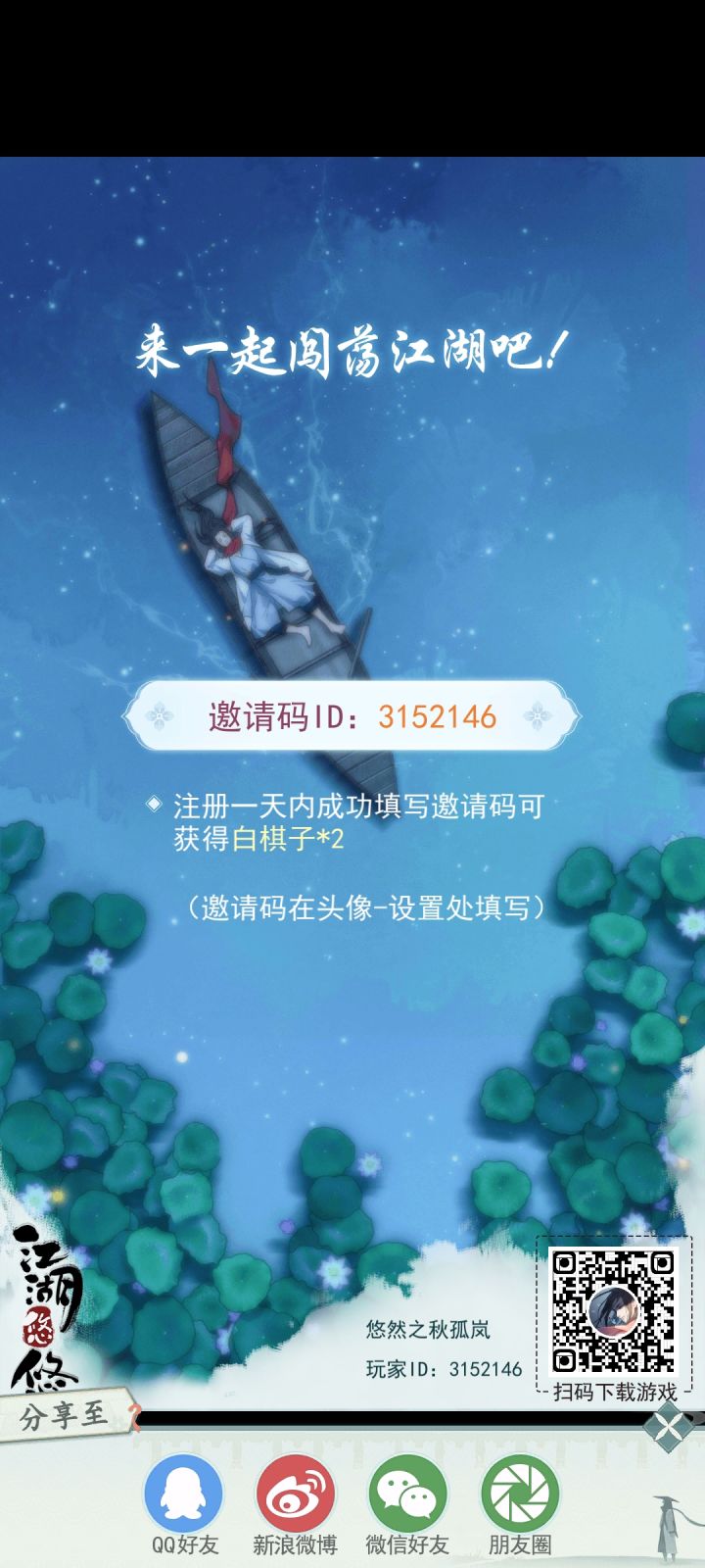 如果觉得有用可以填我的邀请码!可以获得新手奖励白棋子x2!1.进入游戏2级后,点击头像,设置,输入邀请码 2820268添加官方微信公众号【江湖悠悠官方手游】回复:“难道会有人不喜欢鸭子吗?” 获得随机上品武学*1讲一下三倍是什么意思,很多萌新都还不知道,当你抽取到上品武学的时候,有10%的概率出现三倍,右上角会出现三倍字样,接下来看看自己再破局几次可以必出上品,那么我们就单抽到“继续破局一