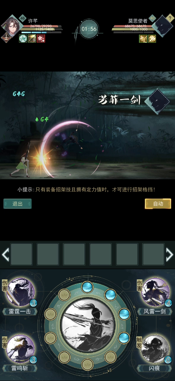 身法内功招架60级VS闪痕剑招60级。长歌折月六、4五、3四锟吾VS1闪痕六、3五、4四、招架三醒世