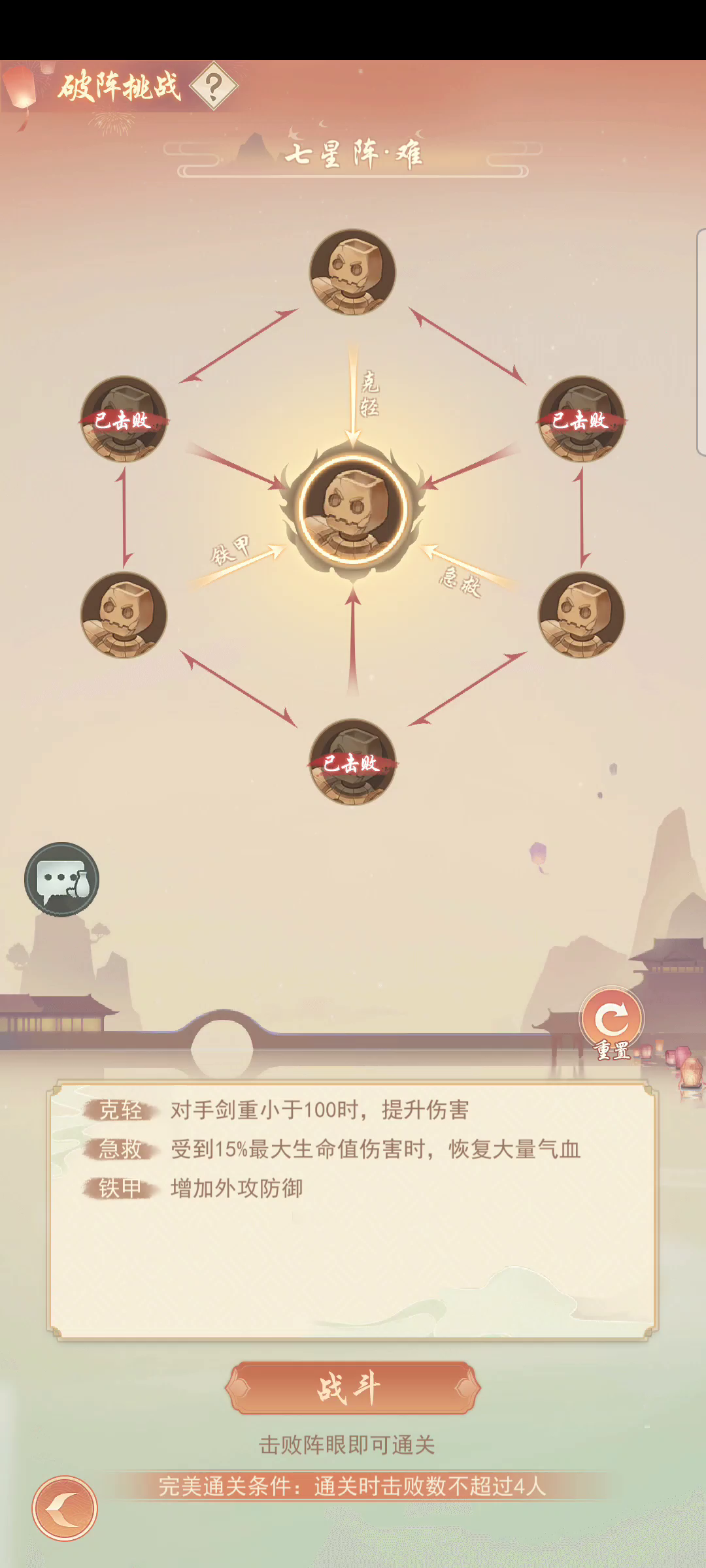 昨天不知道怎么打,亏了5个剑式箱子,今天试了几次,原来把阵眼的小弟揍三遍就可以了,不过要注意看特性词条