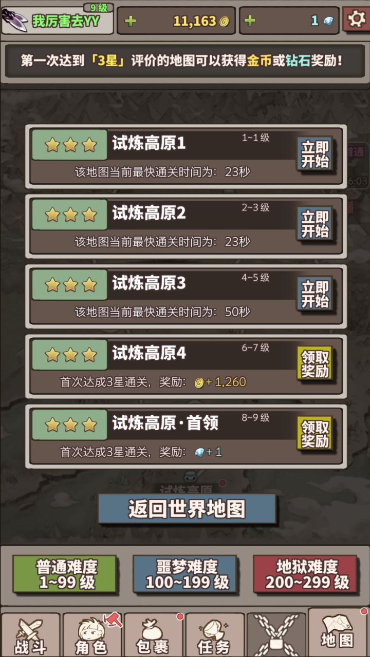 刚开始游戏,我们会发现存档只有两个,开局有6英雄却只能选绿帽,有效挂机时长只有一小时,背包仓库空间有点少。但这都不是什么大的问题。零氪档(存档少,赚钻石慢些)可以发现在任务里面是有很多可以赚钻石的,只不过看到的无非是一钻石,五钻石,其实不然,做到后面会有10钻石的任务,而且不止一个。通关成就奖励得1钻通关boss关卡并获得3星奖励1,1,2,2,3,3,4,4,5,5钻(不要急着去 通过