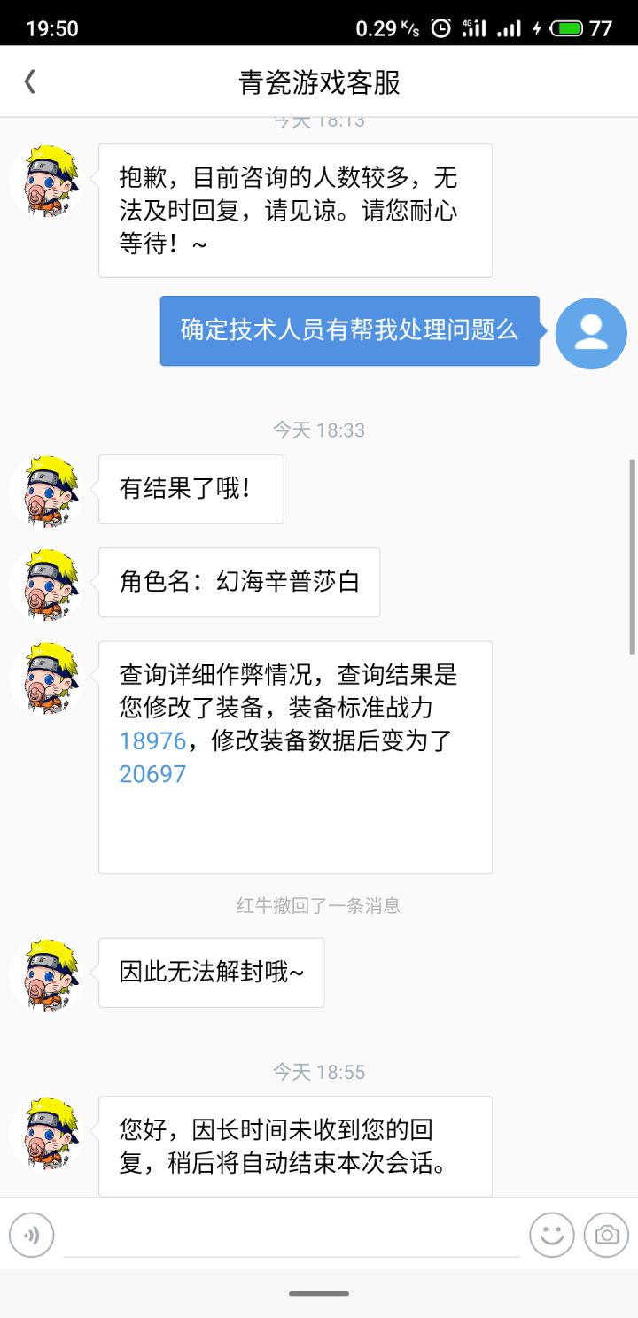 凌晨12点40分左右,在肝刺客的我在打死深渊120级22层的boss的瞬间,我的号被封了,然后等了一整天,下午客服先是说当时是检测到我修改了数据所以封号,具体要等技术员去排查原因,好吧,等了一下午,刚刚回复我说确定是我改了一件装备的数据,改了多少???一千多……头一次玩一款游戏被封,头一次觉得游戏有问题果然是游戏方说了算从我肝地下城堡,贪婪洞窟1/2,不思议,等等各类游戏,从来没用过任何修改器作弊