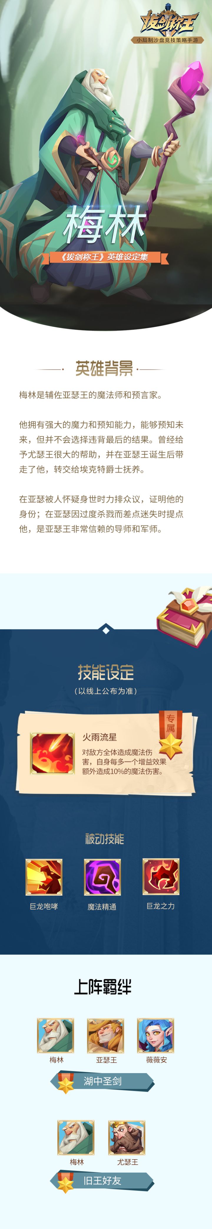 介绍了那么多位骑士之后,梅林终于等来了自己的图鉴。没错这就是我,魔法师、先知、亚瑟王背后的辣个男人!但这都不是重点....虽然我总以长者的外貌呈现在世人面前,但本质还是十分的帅气的小奶狗一枚。薇薇安:你确定...?咳咳,虽然好多领主说我菜,但那只代表近战不行,魔法远程攻击还是很可以的,话不多说,重点见下图哦!