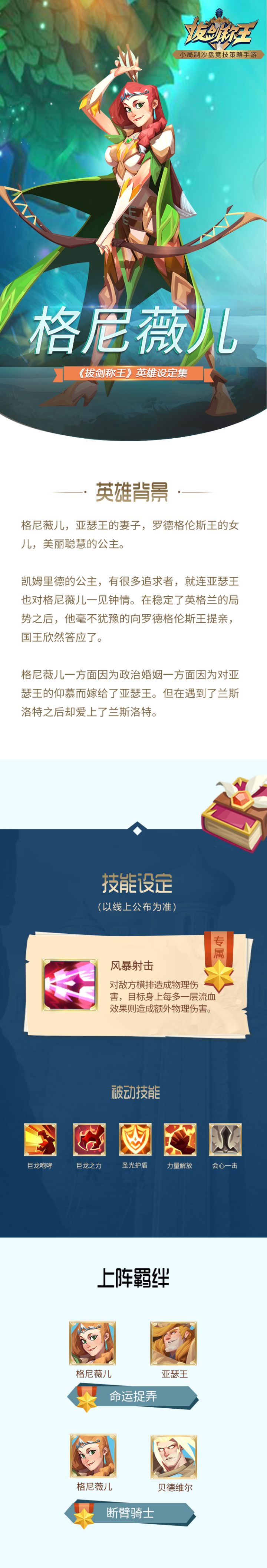 传说格尼薇儿王后拥有令人惊叹的美丽,那美丽足以令所有男人心动;但与美貌成正比的,是她强大物理伤害。在《拔剑称王》中,格尼薇儿不仅能让亚瑟王一见钟情,还能够俘获对手的心,轻而易举帮助领主获得对局的胜利!好啦,话不多说,英雄图鉴看下方~*一切内容以游戏最终上线版本为准
