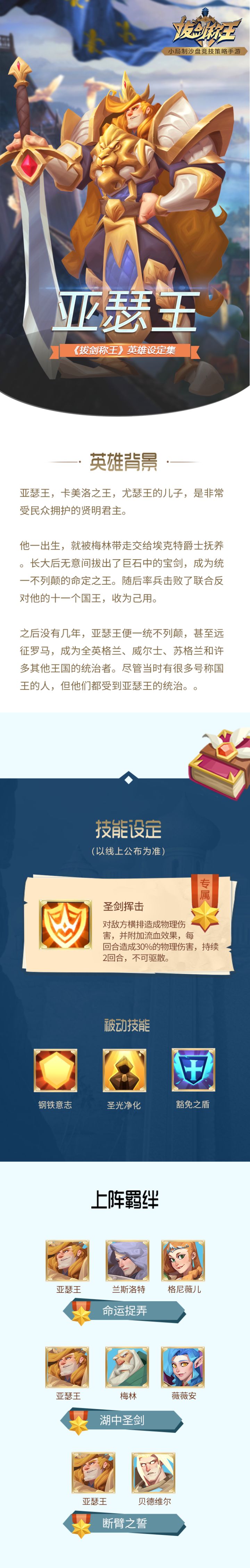 “拔出此石中剑者,即为英格兰之王”亚瑟王的一生无比传奇,梅林一时间不知应从哪里开始介绍。emmm,,虽然他建立起一个繁盛的王国,带领不列颠迎来了空前的统一和强大,但其中也有梅林的一点点帮助。梅林;不愧是我~咳咳,言归正传,与传闻中恪守骑士精神,又善于独立思考的亚瑟王一样,《拔剑称王》中的亚瑟王也是英勇不烦,战斗力和技能伤害爆表,入手这个亚瑟王,领主绝对不亏~