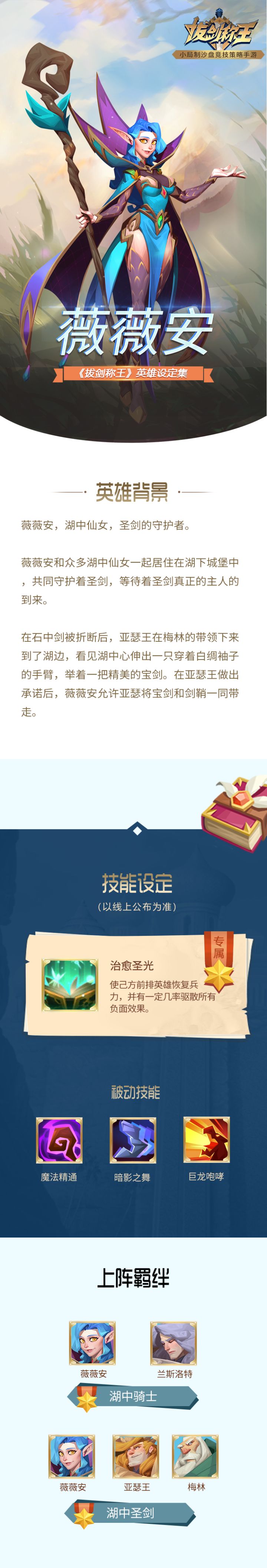 传说中的湖中仙女是英格兰及威尔士神话中出现的数名拥有神奇魔法的妖精,实则却是阿瓦隆湖中出身的既高贵又邪恶的妖女,薇薇安则是她们的代表。在《拔剑称王》中,薇薇拥有强大的治愈术,能够恢复己方兵力的同时并可以驱散所有的负面效果,实乃居家旅行必备良将。