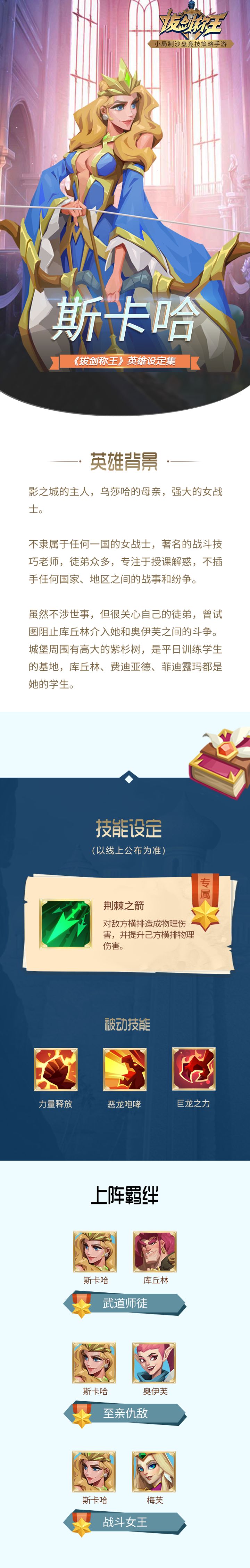 各位领主好,我是卡美洛的大魔法师梅林~在本期的【骑士图鉴】中,梅林要为各位领主介绍的英雄是瑰丽勇者-斯卡哈!作为影之城的女王,除了自身实力的强大之外,斯卡哈也是一名教导武艺的老师。她训练了大量凯尔特英雄跳高技艺、水下打斗、以及荆棘神枪决斗。当然啦,在《拔剑称王》的战场上,斯卡哈作为一名橙色英雄,可以为领主提供强大的助力,接下来去康康这位女王的具体技能吧~